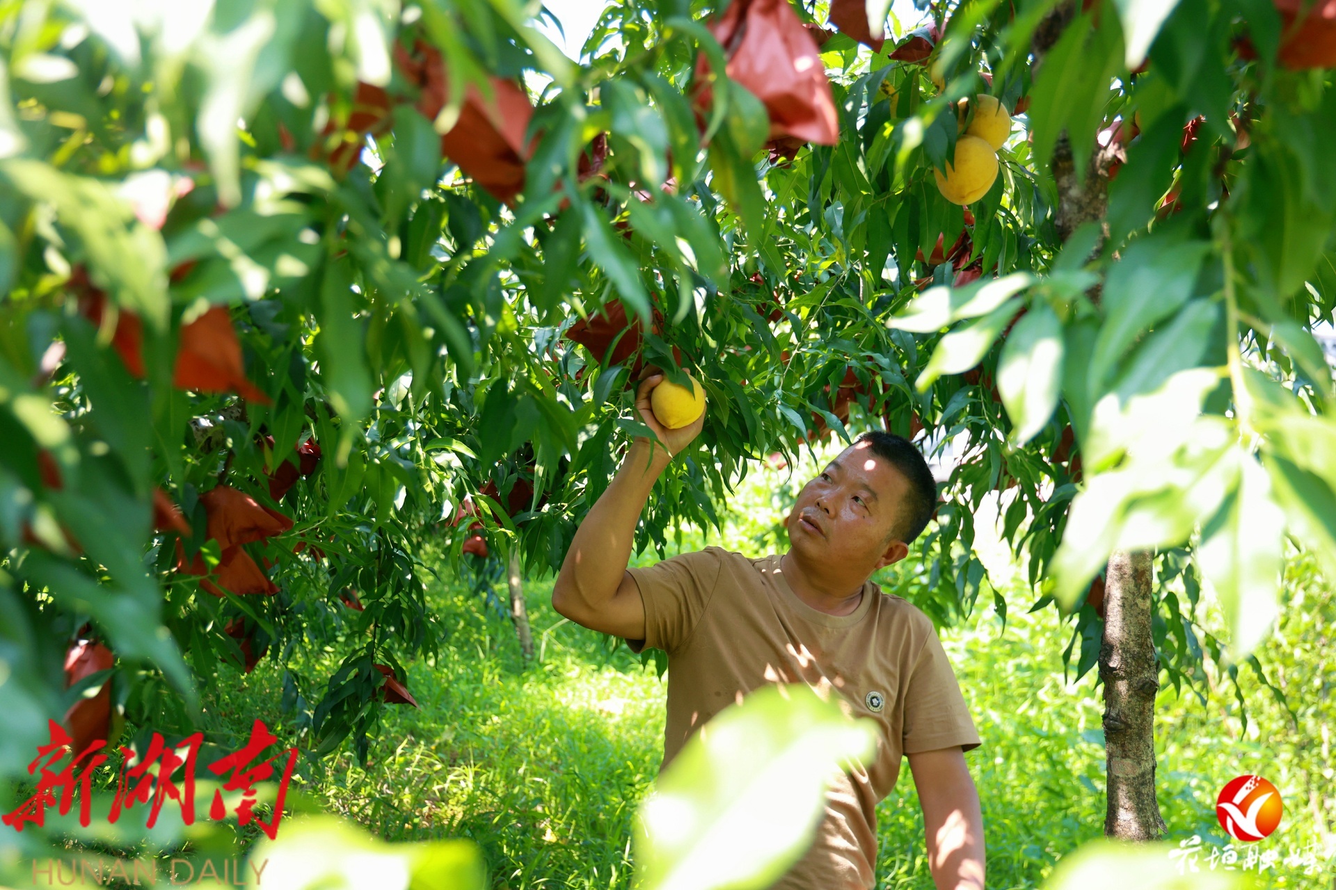 湖南日报·新湖南客户端7月31日讯( 通讯员 杨泽江 肖引霞 实习生 吴思齐 ) 盛夏时节,走进花垣县边城镇踏沙村果农左泽明的边城“桃湘产业缘”黄桃园,葱郁的枝叶间,只见一个个鼓鼓囊囊的浅褐色纸袋缀满枝头,沉甸甸地压弯了枝条。轻轻撕开纸袋,饱满圆润的黄桃便跃然眼前,空气中弥漫着诱人的桃香。
