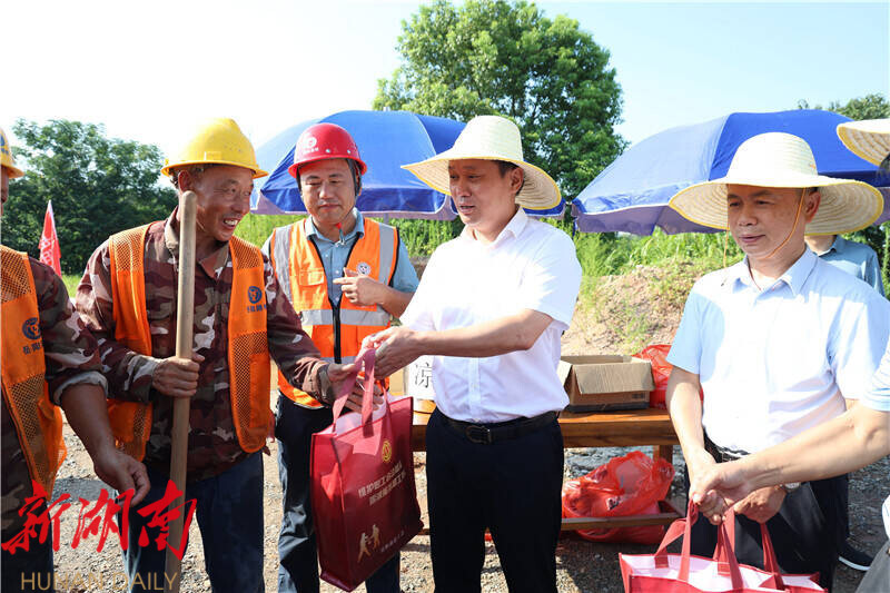在调研项目建设时,吴光文还向高温作业人员致以诚挚问候,并送上防暑降温物资,对施工人员不畏酷暑、坚守岗位的敬业精神给予高度赞扬,并叮嘱他们要注意劳逸结合,落实施工安全和防暑降温措施,确保自身安全和健康。