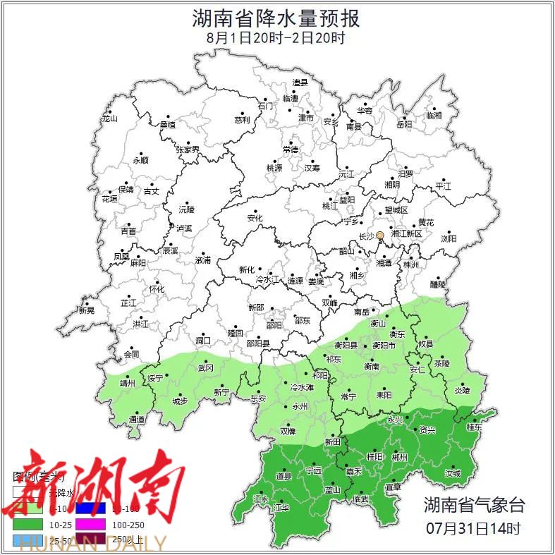 8月1日晚上至2日白天,晴天间多云,其中湘南有阵雨或雷阵雨,永州南部、郴州南部中雨;南风2~3级;最高气温湘中以北37~39℃,其他地区34~36℃,最低气温24~28℃。
