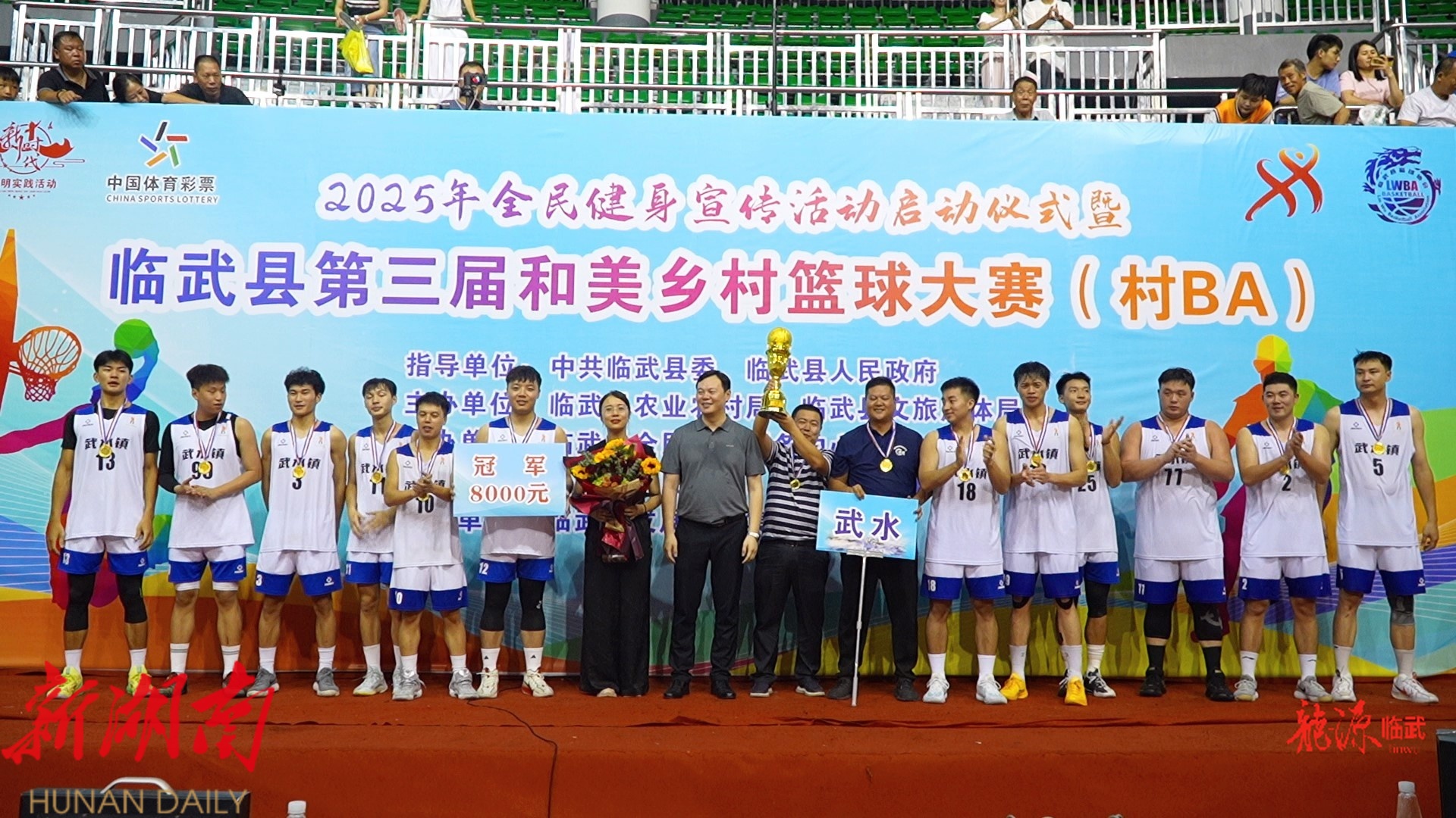 龙源临武客户端8月1日讯(记者 胡懿 雷婉婷)7月31日晚,2025年全民健身宣传活动暨临武县第三届和美乡村篮球大赛(村BA)在县文体中心圆满落下帷幕。经过激烈角逐,武水镇力压群雄斩获冠军。