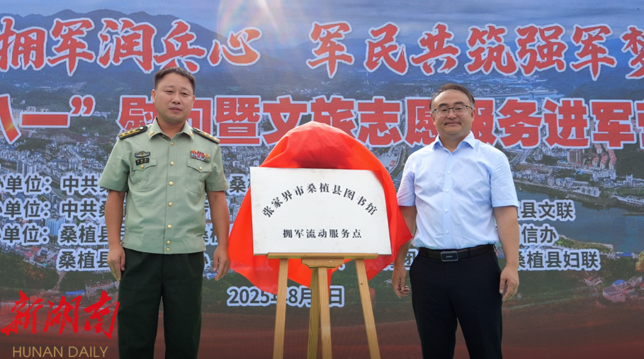 活动现场,李鹏彬与梁高武共同为“桑植县图书馆拥军流动服务点”揭牌。该服务点设立后,县图书馆将定期为驻桑部队送来各类图书,进一步满足官兵们的阅读需求,丰富军营文化生活。