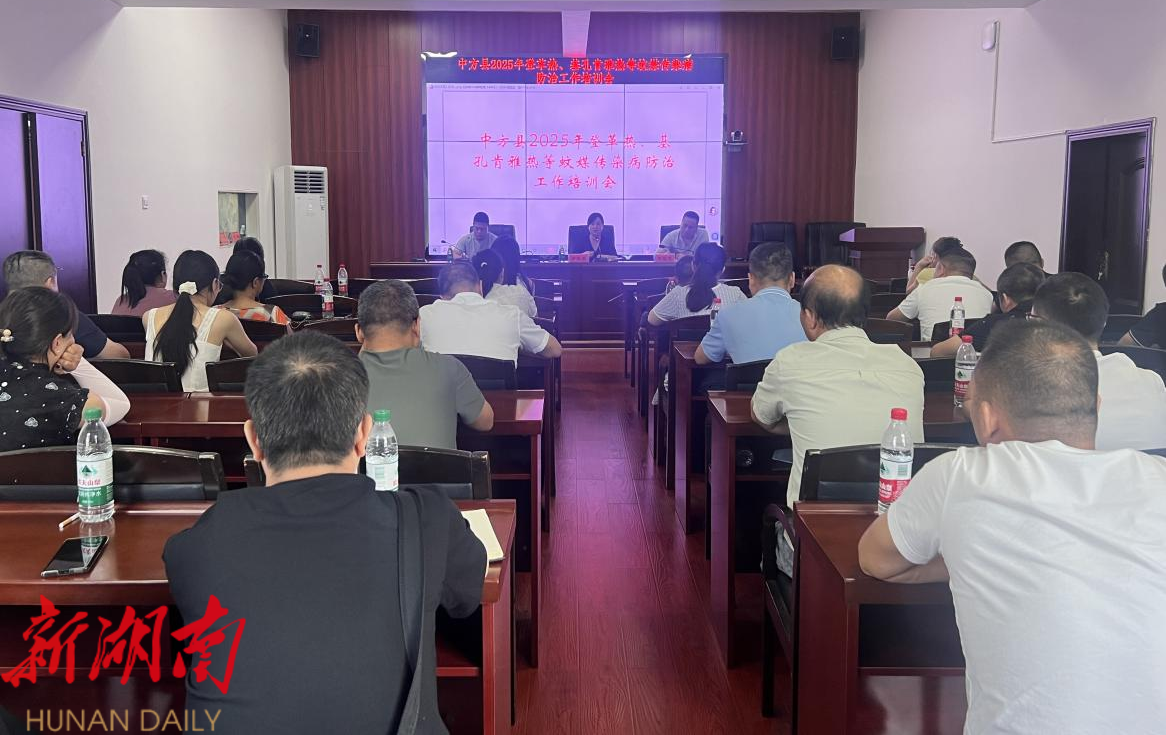 中方融媒8月2日讯 (通讯员:安芋静)为应对登革热、基孔肯雅热等蚊媒传染病风险,提升医疗机构早期识别和防控能力,8月1日上午 ,中方县召开2025年蚊媒传染病防治专题培训会。全县各级医疗机构分管领导、骨干医生及民营医院负责人参加。