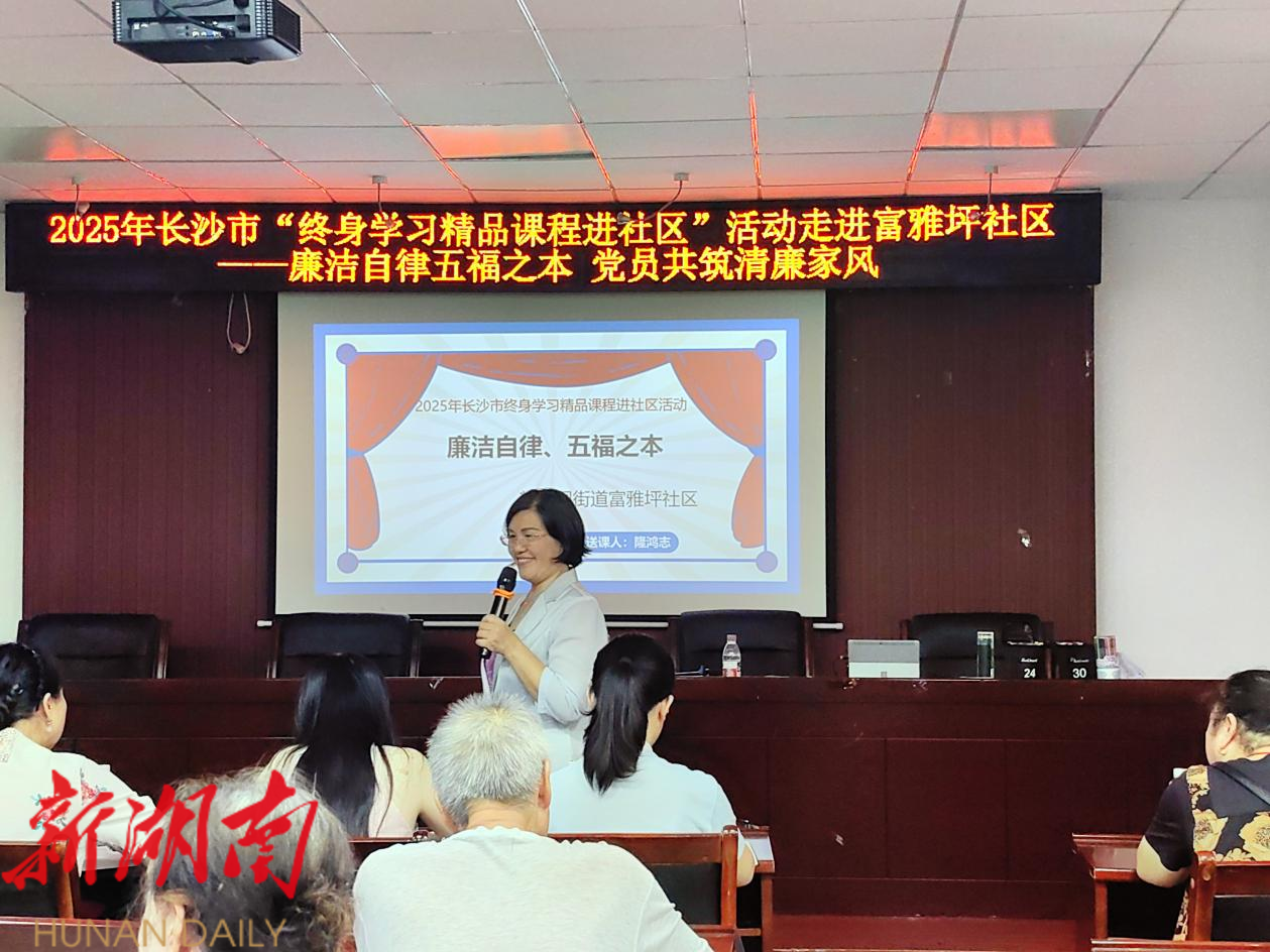 湖南日报·新湖南客户端8月2日讯(通讯员 朱秀云)8月1日,长沙市“终身学习精品课程进社区”活动在开福区望麓园街道富雅坪社区新时代文明实践站成功举办。本次活动聚焦廉洁家风建设,以《廉洁自律、五福之本》为主题,为50余名社区党员干部和退役军人带来一堂深刻的家风教育课。