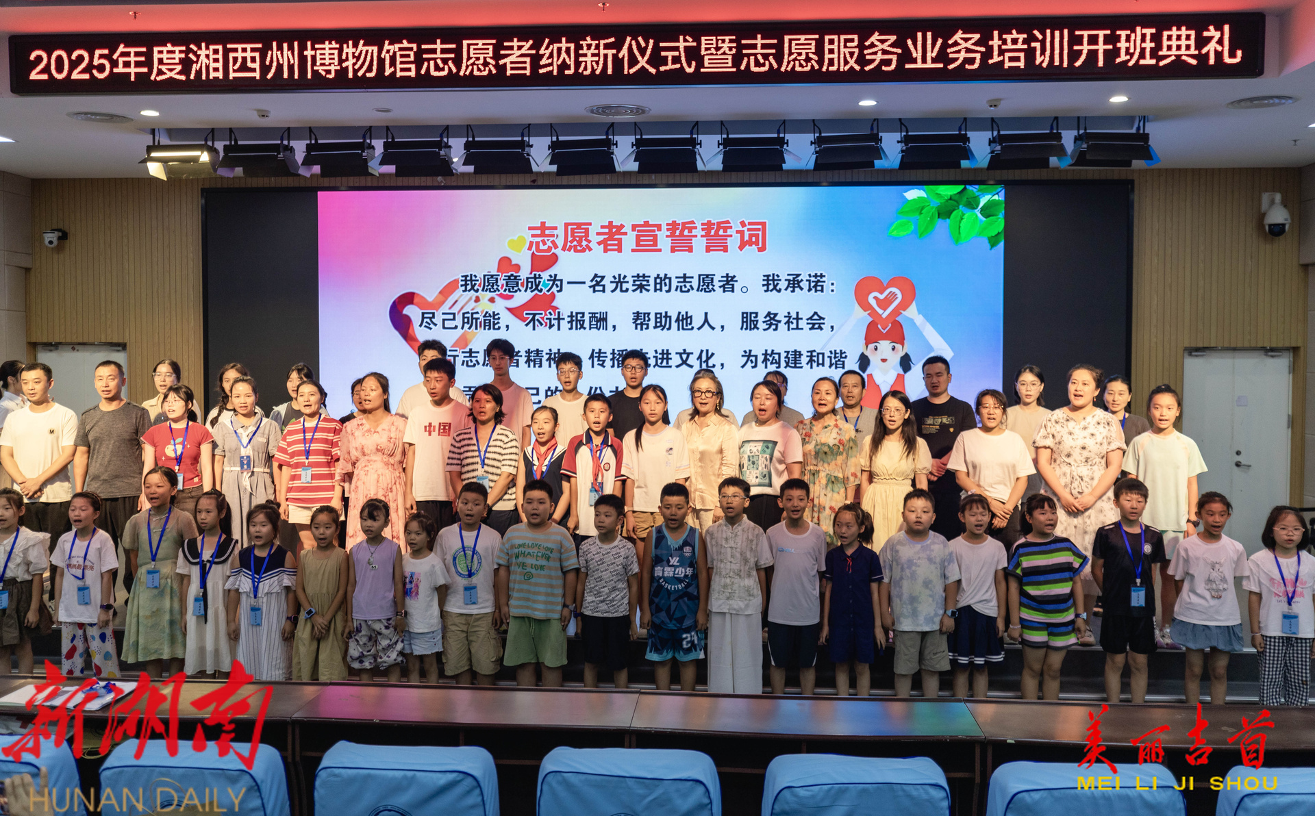 2025年8月1日,湘西州博物馆志愿者纳新仪式暨志愿服务业务培训开班典礼活动现场,新老志愿者在宣誓。