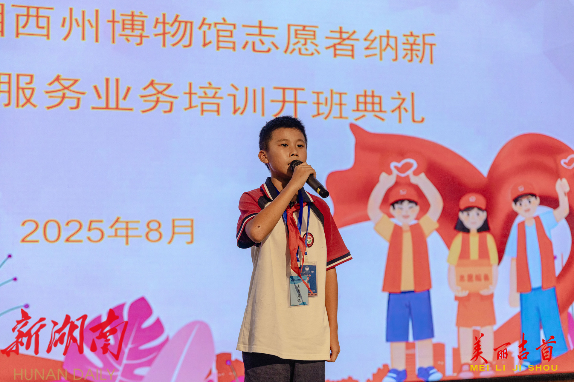 吉首市融媒体中心8月2日讯(全媒体记者 彭璟)2025年8月1日,湘西州博物馆,往届志愿者在为新招募志愿者讲解开班第一课,传递志愿薪火。当天,2025年度湘西州博物馆志愿者纳新仪式暨志愿服务业务培训开班典礼活动正式启动,60名新招募志愿者将在8月1日—8月27日期间,通过接待服务、普通话、土家族民歌、苗画等内容进行集中培训,进一步提升志愿讲解服务能力,传承和守护好中华优秀传统文化。