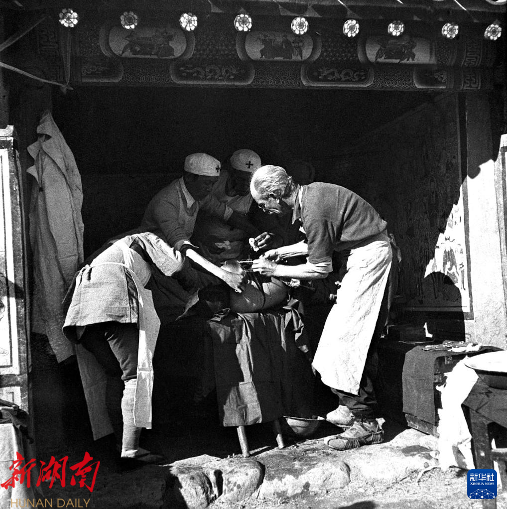 白求恩的到来,对缺医少药的晋察冀抗日根据地军民来说无异于雪中送炭。在晋察冀军区后方医院,他一个月内为147名伤员做了手术;在广灵公路伏击战中,他连续工作40个小时,为伤员做手术71例;在冀中抗日前线,他4个月行程750余公里,进行战地手术315次……他还及时总结战伤治疗经验,编写了与抗战实践相结合的医学专著,迅速提高了八路军医务人员的战地救护水平。