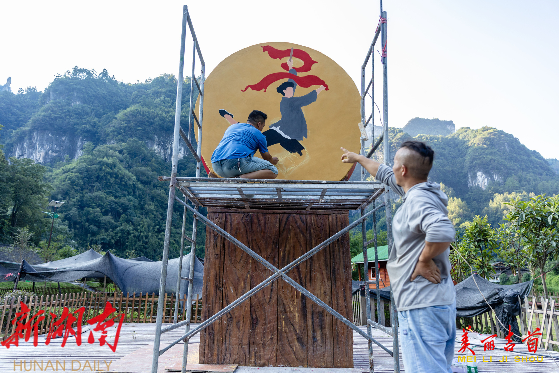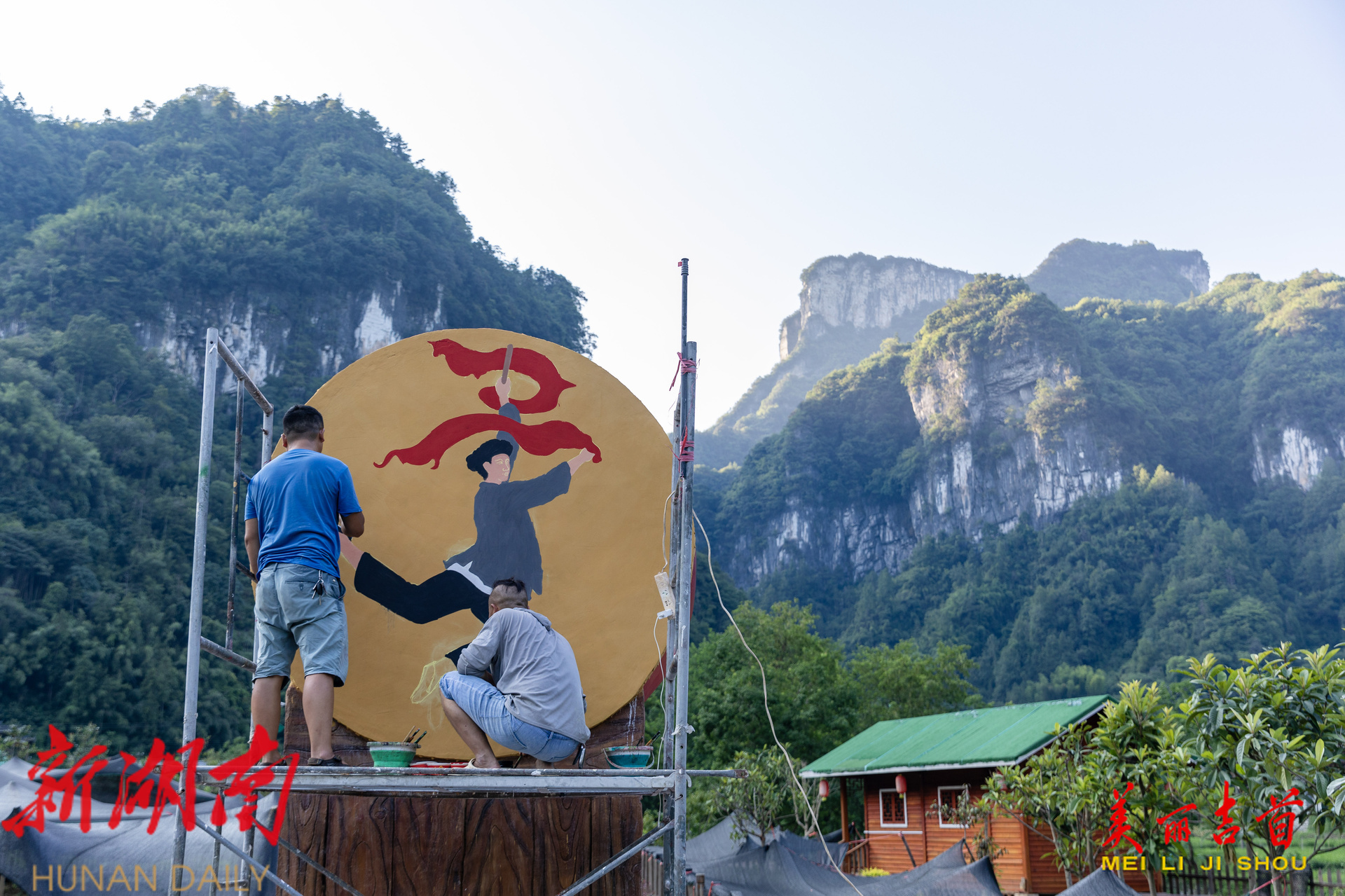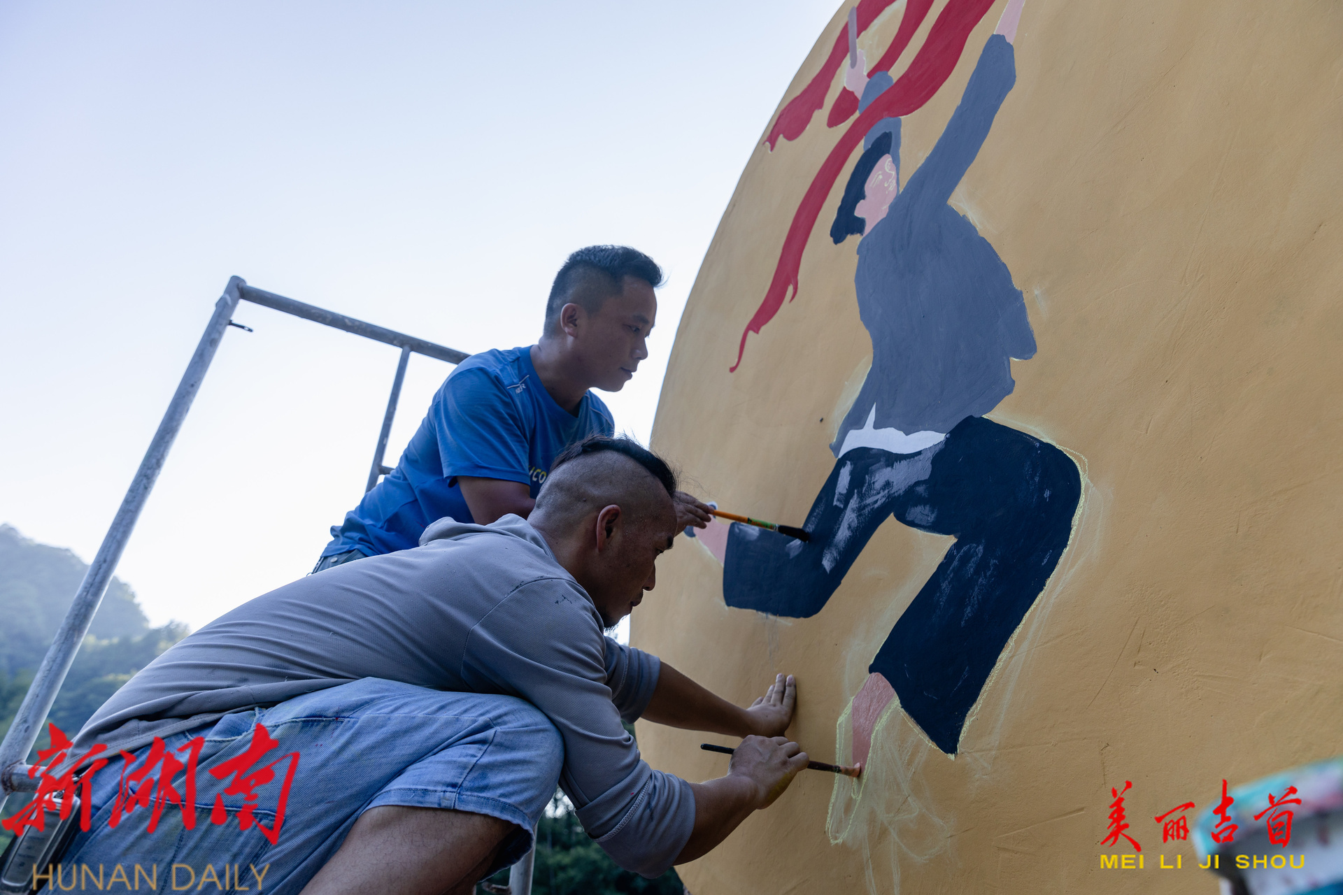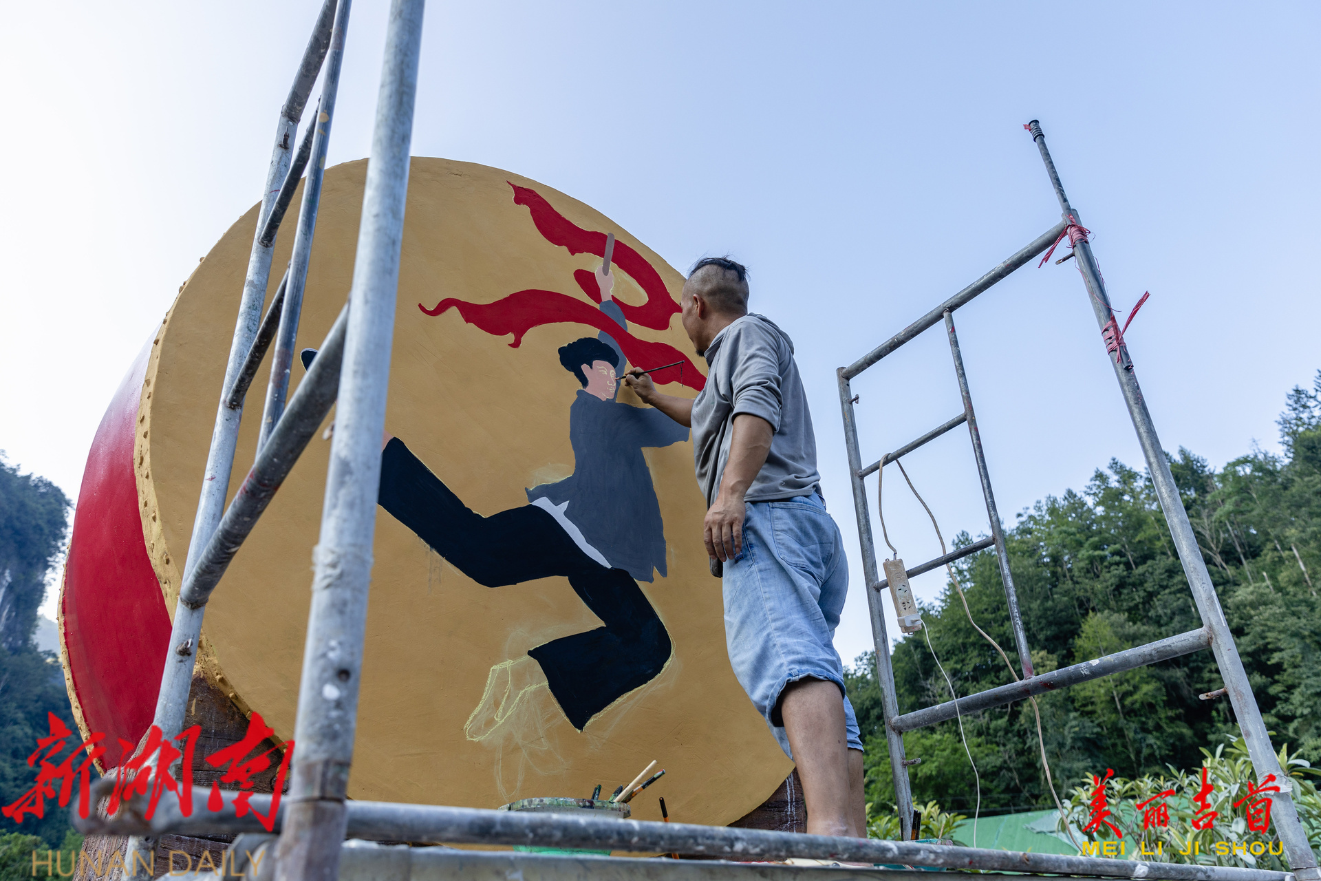 吉首融媒8月3日讯(全媒体记者 彭璟)2025年8月2日,吉首市矮寨镇坪年村,墙绘师正为石塑苗鼓绘制苗族传统纹样。近年来,该村依托“中国传统村落”和“中国少数民族特色村寨”优势,通过庭院美化、文化墙绘、传统民居保护等措施焕新苗寨人居环境面貌,推动苗族文化传承与乡村旅游融合发展。