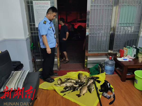 当日凌晨3时许,渔政值班人员通过监控系统巡查时,发现武陵源区索溪河罗公平段禁渔区内有可疑人员使用电鱼设备非法捕捞,立即向区农业综合行政执法大队通报案情。执法大队迅速组织精干力量赶赴现场,当场查获正在实施电鱼作业的杨某等3人,并依法扣押电鱼棍、护目镜、强光电筒等作案工具,缴获非法渔获物17.9千克。目前,案件正在进一步调查处理中。