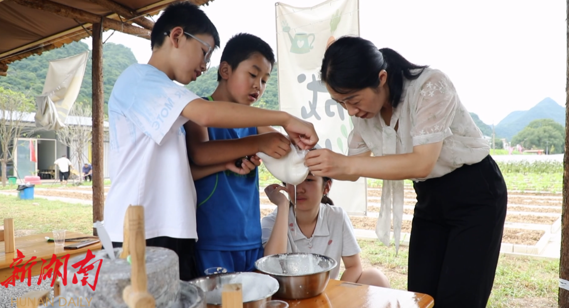 盛夏时节,九疑瑶族乡新塘村的九疑农耕体验园里,葡萄藤上硕果累累,水塘边笑语阵阵。游客们或挎着篮子采摘葡萄,或围着石磨体验磨豆浆,或挽起裤脚在水塘里捕捞鱼虾,沉浸式感受农耕乐趣。“进来之后,这些流程全部玩下来的话,一个上午都玩不完的。”宁远县辰华农业有限公司负责人陈友军说道。