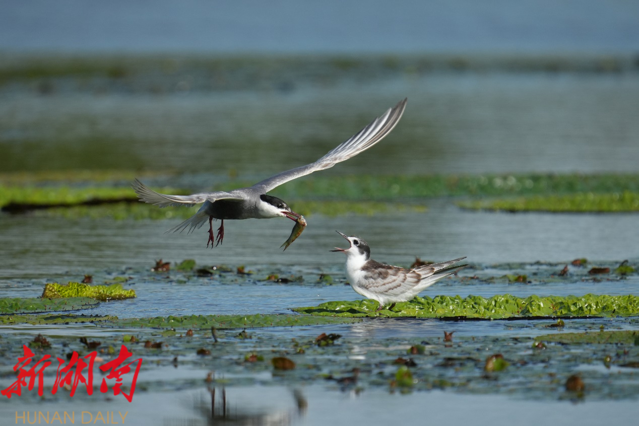 湖南日报·新湖南客户端8月5日讯(通讯员:杨波) 盛夏的洞庭湖区,岳阳湘阴白泥湖的芡实塘里藏着一方热闹天地。水面上漂浮的圆叶间,白点似的须浮鸥正舒展着翼尖,翅羽掠过水面时带起细碎的银弧。这些白色的精灵把巢筑在芡实的叶茎间,灰褐色的雏鸟挤在巢里,时不时探出毛茸茸的脑袋,发出尖细的啾鸣。成鸟们展开双翅,在塘面上空划出优美的弧线。它们从远处的水域叼来小鱼,尖喙衔着猎物低空掠过,翅膀带起的风拂动水面,惊得芡实叶轻轻摇晃。归巢的瞬间,雏鸟们立刻扑腾着争抢,小鱼在巢边闪烁着银光,很快便成了幼鸟的美餐。