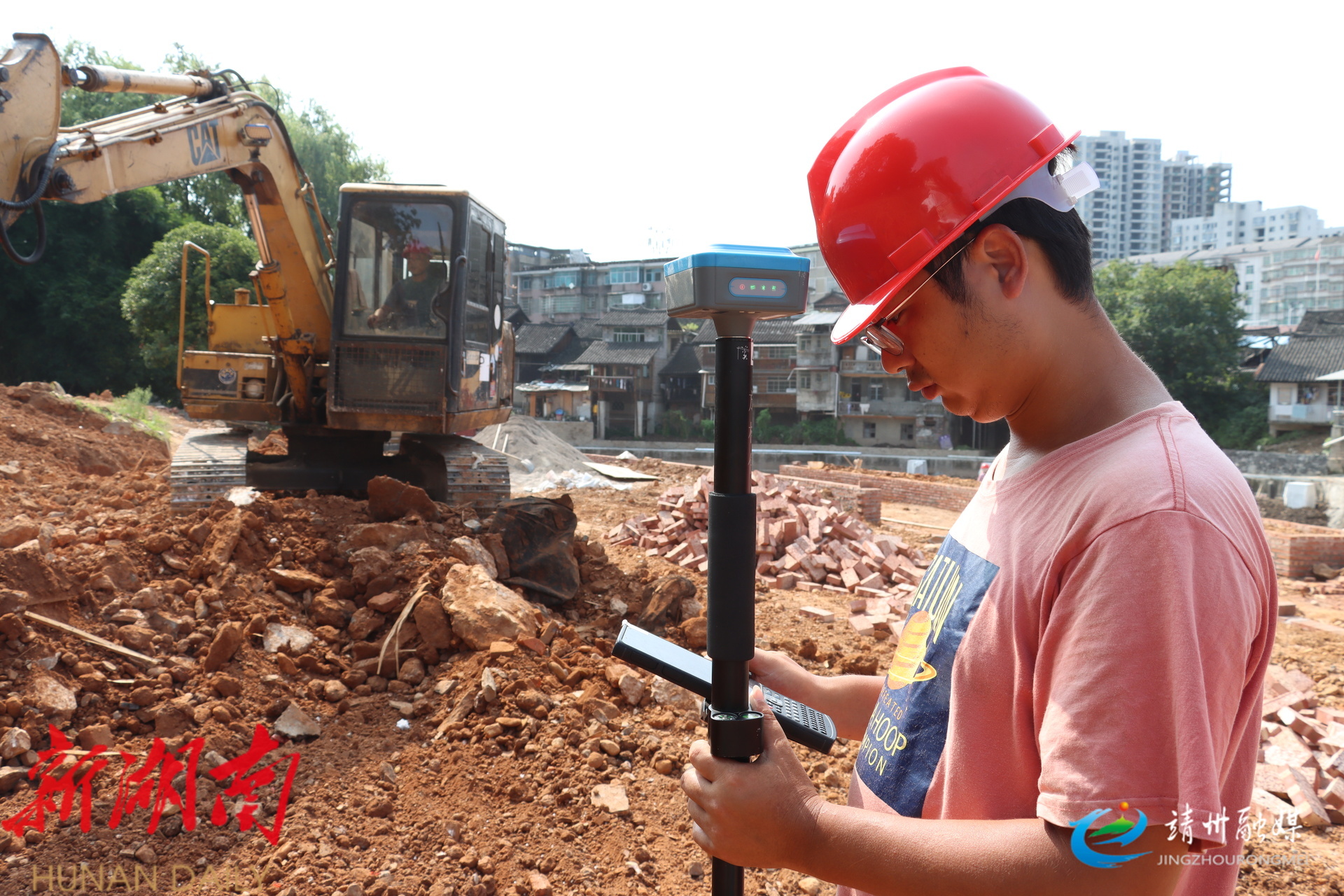 工作人员用RTK仪器进行土方开挖的标高测量控制(许梦娟 摄)