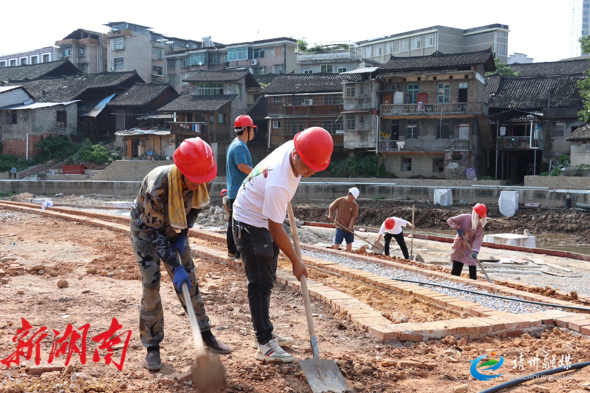 8月5日,靖州老旧小区改造项目(河街社区)潩溪广场施工现场一片繁忙。机器轰鸣声中,工人们正抓紧进行场地平整、河道清淤等作业,为后续浮桥安装做准备。