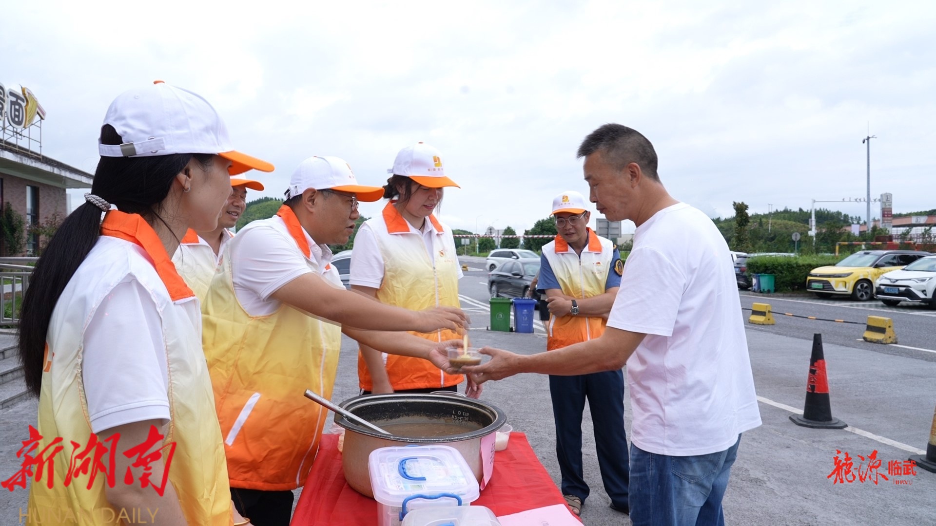 在临武收费站出口和临武服务区,志愿者正在为过往司乘人员送上冰镇绿豆汤、藿香正气水等 防暑降温物资。