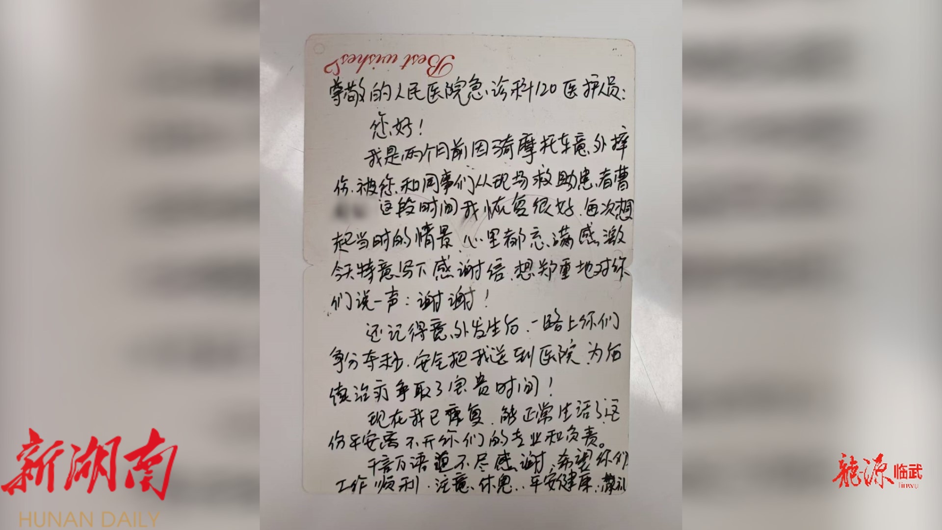 龙源临武客户端8月6日讯(记者 黄玲艳 雷婉婷 邓圣立)近日,临武县人民医院急诊科收到了一封特殊的感谢信。信中,康复患者曹女士用真挚的语言讲述了几个月前一场生死救援——120急救团队在执行任务途中,凭借职业警觉救下了并非接诊对象的她,上演了一场动人的生命接力。