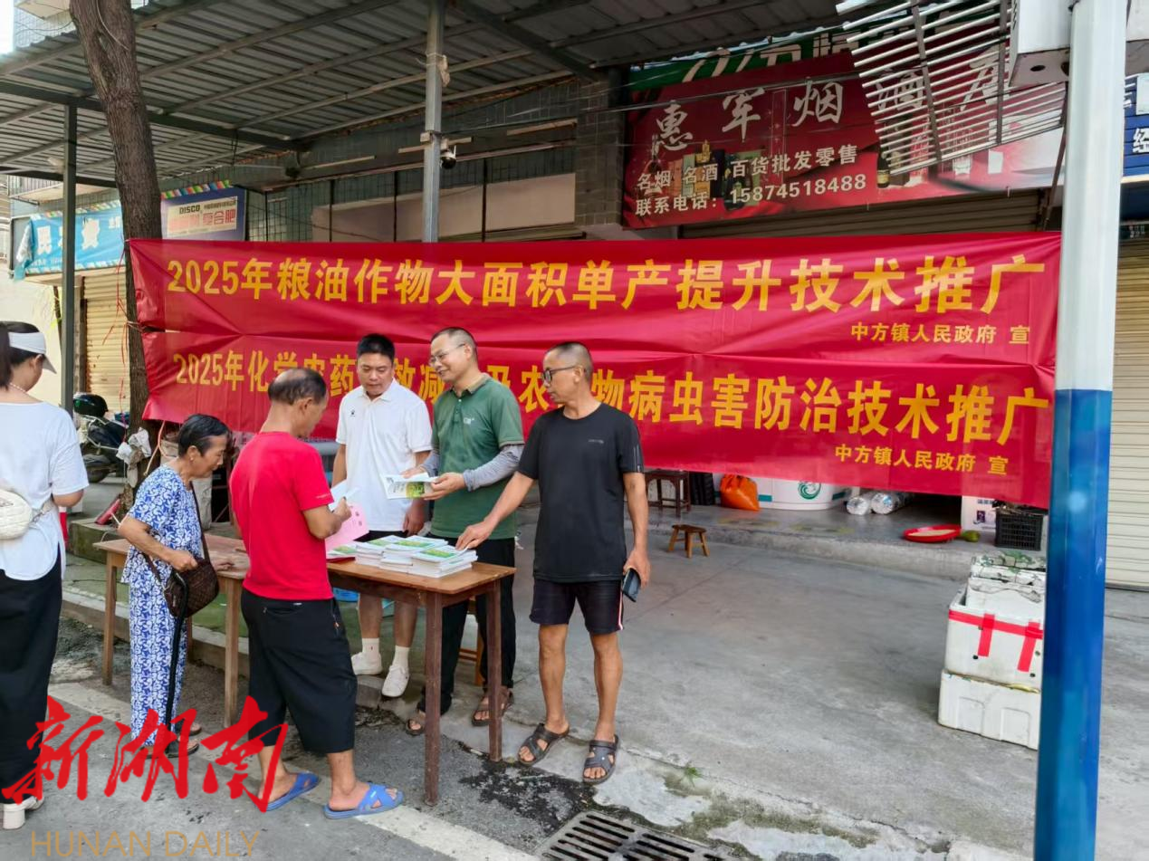 中方融媒8月7日讯 (通讯员:邱芬芳)为扎实推进化学农药减量增效,有效提升粮油作物单产提升水平,8月3日至4日, 中方镇人民政府在集贸市场组织开展了“2025年化学农药增效减量与农作物病虫害防治技术推广”和“2025年粮油作物大面积单产提升技术推广”活动。镇农业综合服务中心负责人带领技术人员深入一线,现场指导农户科学用药,提升防治技能。