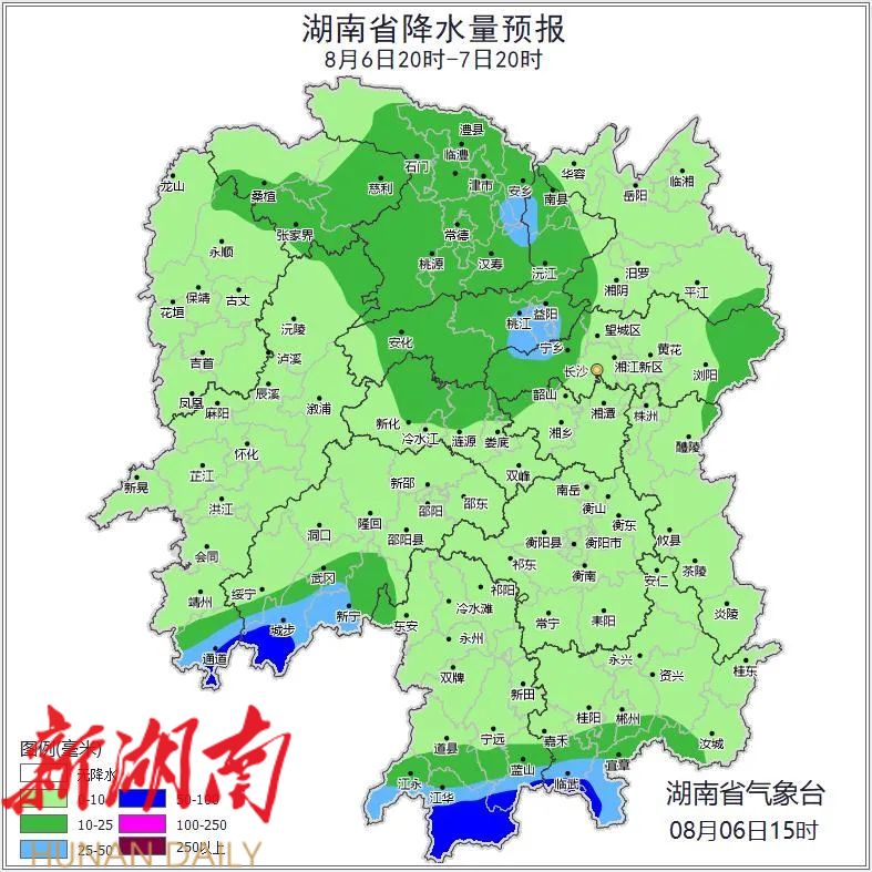 8月7日白天,多云有小到中等阵雨或雷阵雨,其中怀化南部、邵阳南部、永州南部、郴州南部、常德中部、益阳中部大雨,怀化(通道)、邵阳(绥宁、城步)、永州(江华、蓝山)、郴州(临武、宜章)暴雨;南风2~3级,雷雨时局地阵风7~8级;最高气温湘西湘北34~36℃,其他地区29~32℃,最低气温24~27℃。