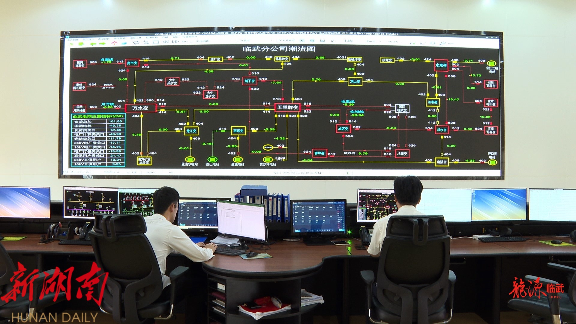 与此同时,在郴电国际临武分公司的调度中心,大屏幕上实时跳动着全县电网运行数据。值班人员正全神贯注地盯着电力潮流图,通过可视化系统密切监控全县电网的电能流动方向、流量及电压分布等数据,随时准备应对突发状况。