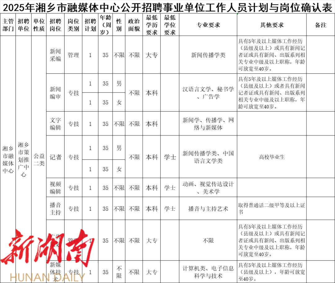 2025年湘潭湘乡市融媒体中心招聘事业单位工作人员10人公告