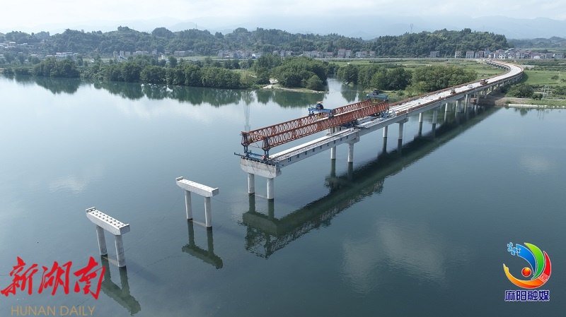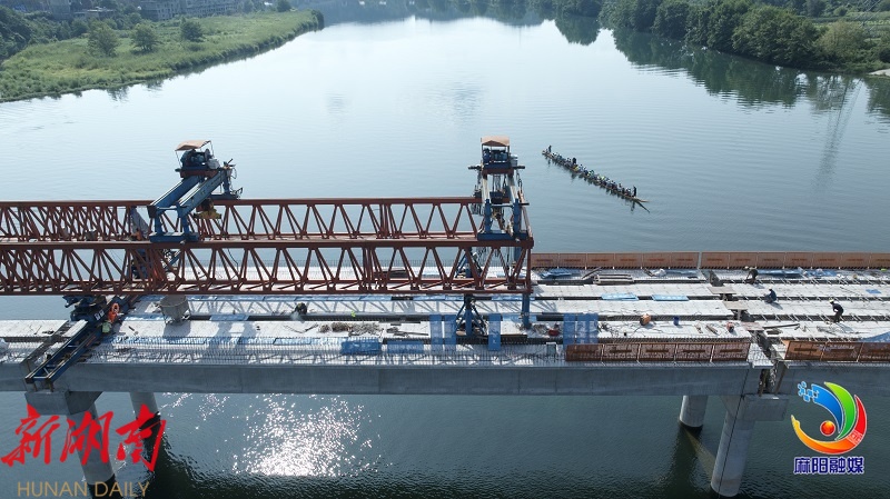 麻阳融媒8月8日讯(记者 龙玥橦 符宁波) 8月6日,记者来到S332麻阳福堂山至漾头公路工程一期的关键控制性节点——锦和二桥的施工现场。庞大的桥梁搭建机械高耸入云,工人们正精确地操控着机械,执行T型梁的提升和精确放置工作。这座全长746米的大桥,犹如一条即将腾飞的钢铁巨龙,横跨锦江河两岸。