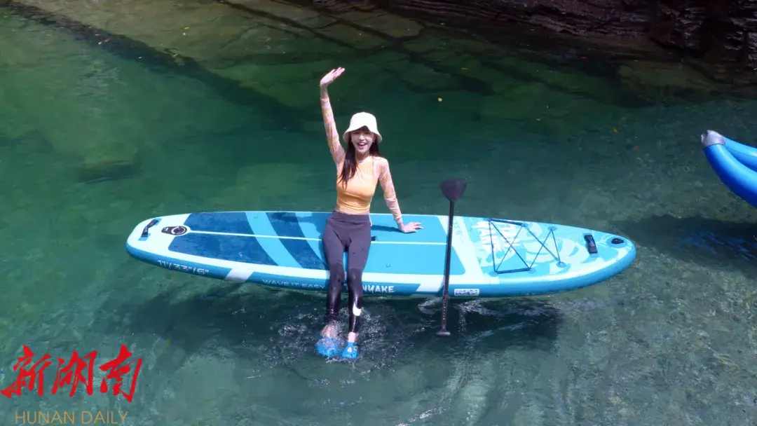 湖南日报·新湖南客户端(通讯员 郭军 瞿桂林 谷蕊眩) 8月8日清晨,桑植县五道水镇水田坝村黄连台大峡谷便迎来了游客。清澈见底的溪流中,孩童们挽着裤腿在下游浅滩翻捡石块,捕捉小鱼小虾的欢笑声在山谷回荡;上游碧潭深处,大人们或悠然划动桨板,或乘着充气船随波嬉戏,山涧水花与笑语交织成一幅生动的盛夏避暑图景。在这清凉秘境中,一个熟悉的身影格外引人注目——自媒体达人葡小映,正带着她的家人重访桑植,专程奔赴心仪已久的黄连台。