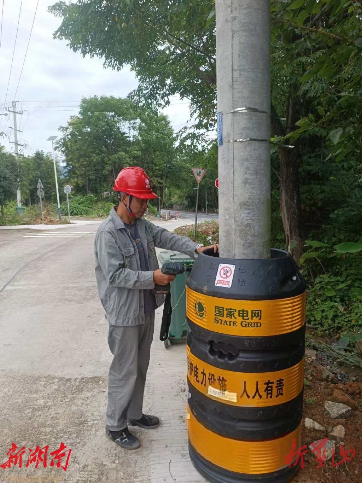 新蓝山客户端8月11日讯 (通讯员 黄章成 李和平)“师傅,您开车时请注意公路旁电杆,要是碰到了后果将不堪设想,这是我们公司电力设施保护知识宣传资料,请您看一下。”“供电公司想得就是周到,电杆装上的这个反光防撞桶,很醒目,夜晚开车时安全多了!”8月10日,国网蓝山县供电公司塔峰供电所组织工作人员在10千伏所云线、10千伏古花线安装电力线路电杆防撞桶和夜间反光标识,为沿靠马路存在“高风险”的电杆“穿上”醒目的“防撞铠甲”。