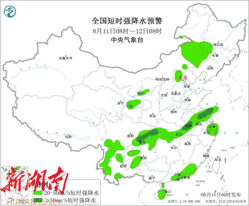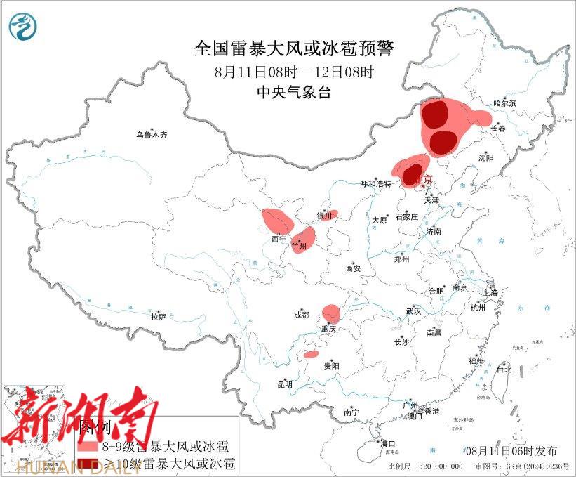 预计8月11日08时至12日08时,内蒙古东部、华北北部、西北地区东部、西南地区东部等地的部分地区将有8级以上雷暴大风或冰雹天气,其中,内蒙古东部、河北西北部等地的部分地区将有10级以上雷暴大风,最大风力可达11级以上;内蒙古东部、华北北部、西北地区东部、江淮、江汉、江南北部、西南地区东部、华南南部等地的部分地区将有小时雨量大于20毫米的短时强降水天气,其中,安徽中部、江苏中部、湖北西部、四川东南部、重庆中西部和东北部等地的部分地区小时雨量大于50毫米,最大可达70毫米以上。