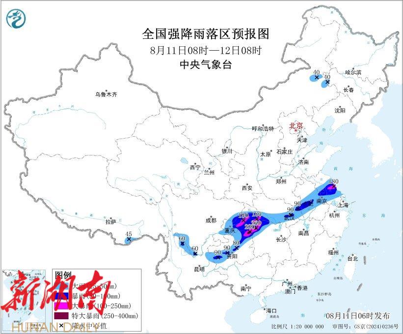 预计,8月11日08时至12日08时,苏皖中部、湖北东部和南部、湖南西北部、四川东部和南部、重庆、贵州中西部和东北部、云南北部以及内蒙古中东部等地部分地区有大到暴雨,其中,江苏中部、湖北西南部、湖南西北部、重庆中东部、贵州东北部等地部分地区有大暴雨,湖南西北部、重庆东南部等地局地特大暴雨(250~280毫米)。上述部分地区伴有短时强降水(最大小时降雨量20~50毫米,局地可超过70毫米),局地有雷暴大风等强对流天气。