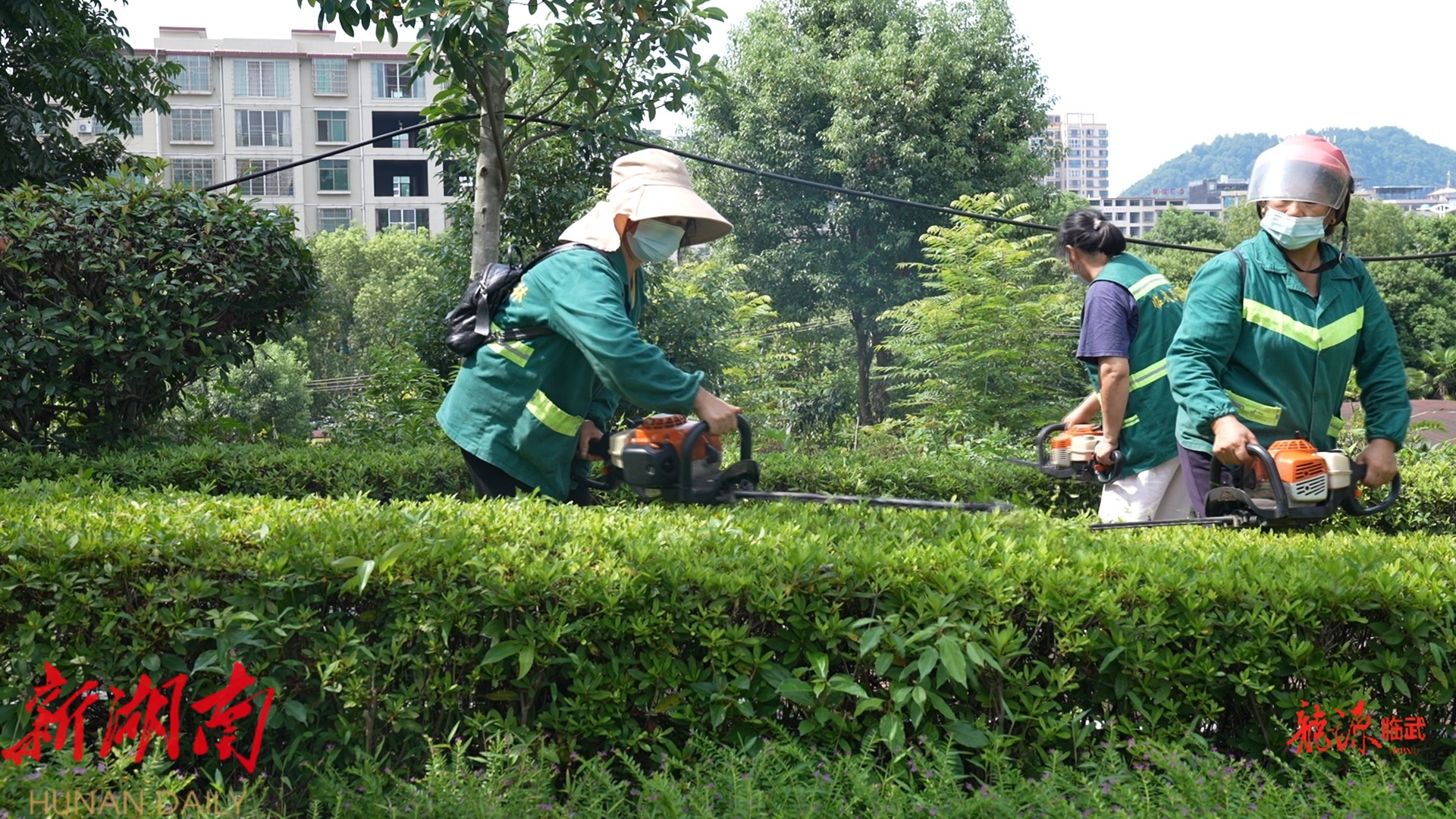 与此同时,园林工人顶着烈日坚守在一线,手持修枝剪与除草机,为县城绿化树木“梳妆打扮”,用汗水装点出整洁美观的城市轮廓。