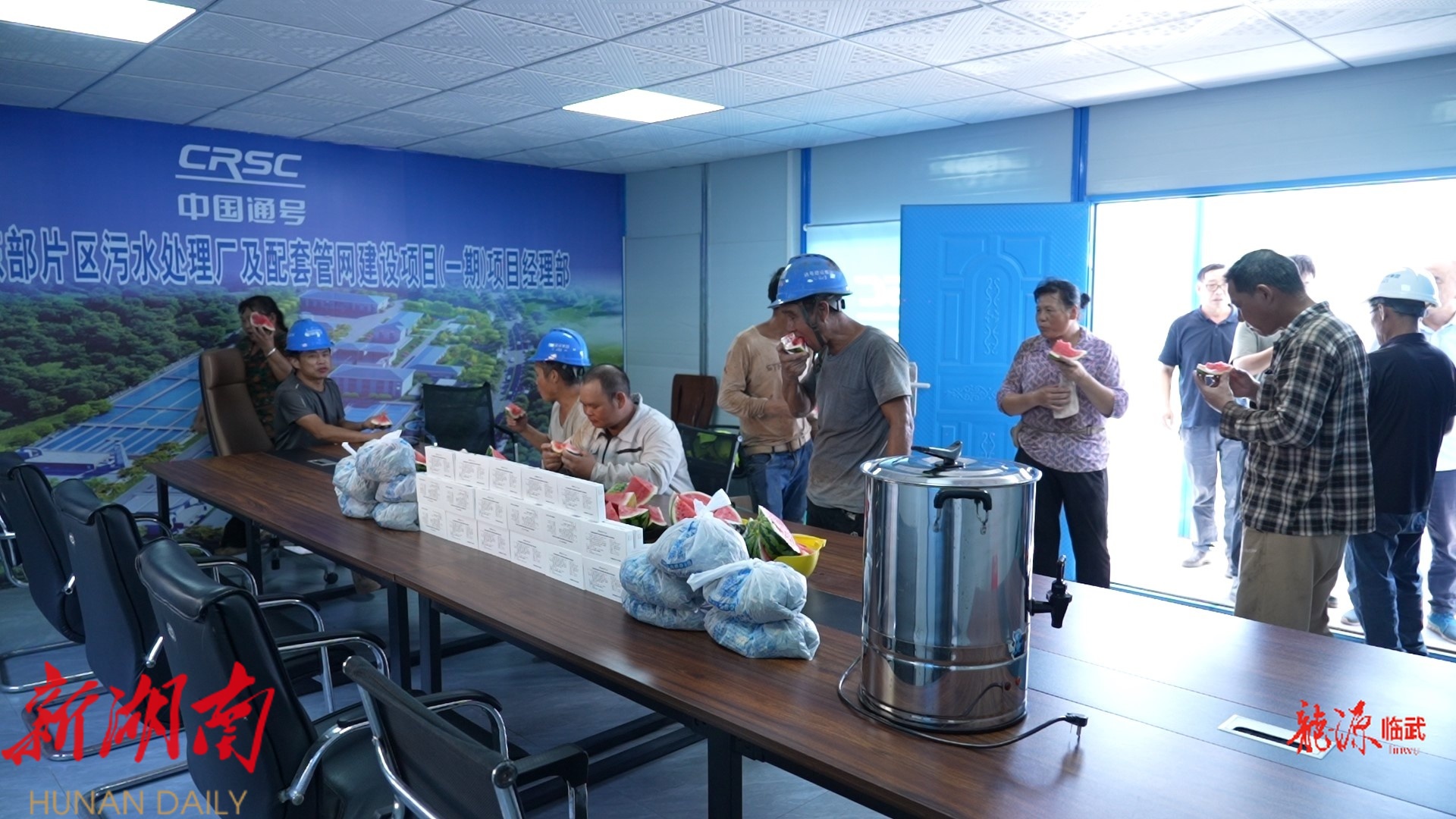 在东部片区污水处理厂项目建设现场,工人们正顶着烈日紧张施工。作为临武高新区重要的基础设施项目,目前工程已进入收尾攻坚阶段。通号建设集团采取错峰施工方式,并在施工现场设置了多个室内室外休息站,为工人们提供西瓜、凉茶、藿香正气水等防暑物资,切实保障一线工人的身体健康。