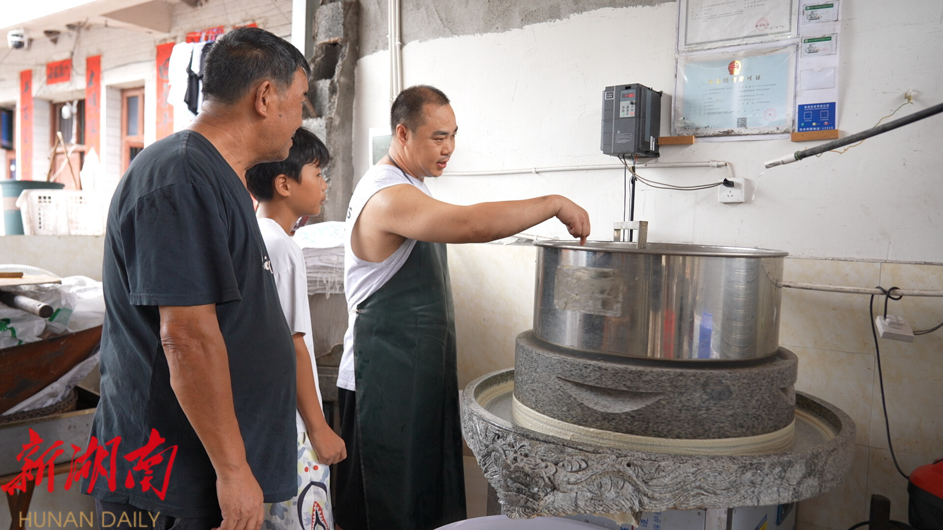 在花桥镇的青山绿水间,黄烈超注册成立中方县润泽生态农场有限公司,亲手建起缘缘石磨豆腐坊。他为每道工序立下“军令状”:黄豆要经过筛杂、比重、芽率三道检测关,山泉水需通过沉淀、超滤、灭菌三重净化,就连石膏点卤的时间都精确到秒。最特别的是每块豆腐上那枚他设计的“花石磨”标识,如同微型军功章般印刻着承诺。更令人称道的是,他创新采用的电动石磨工艺既守住了老味道,又让日产能力提升三倍。“我们这里的电动石磨机装了变频器,专门控制运转速度,做出来的口感和传统人工石磨一模一样。” 黄烈超一边操作着电动石磨机,一边高兴地说。