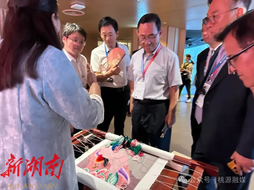 在湖南活动周的现场, 省级非物质文化遗产“ 桃源刺绣 ”代表性传承人罗明华 现场展示了桃源刺绣的精湛技艺。她坐在绣架前,手中的绣针如同灵动的精灵,在绷紧的绣布上穿梭自如。五彩斑斓的丝线在她的巧手下,渐渐勾勒出一幅幅生动的图案。周围围满了国际观众和日方专家、学者,他们被罗明华娴熟的技艺所吸引,纷纷驻足观看,不时发出阵阵惊叹。