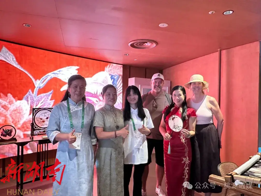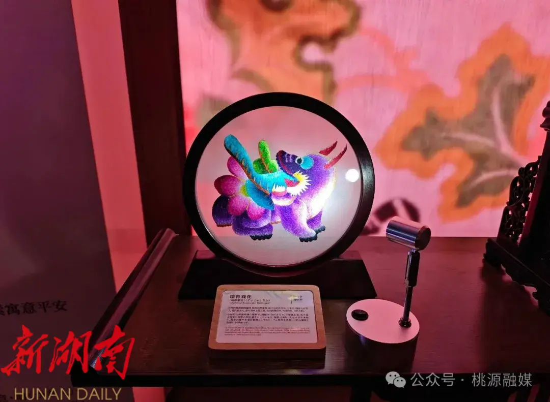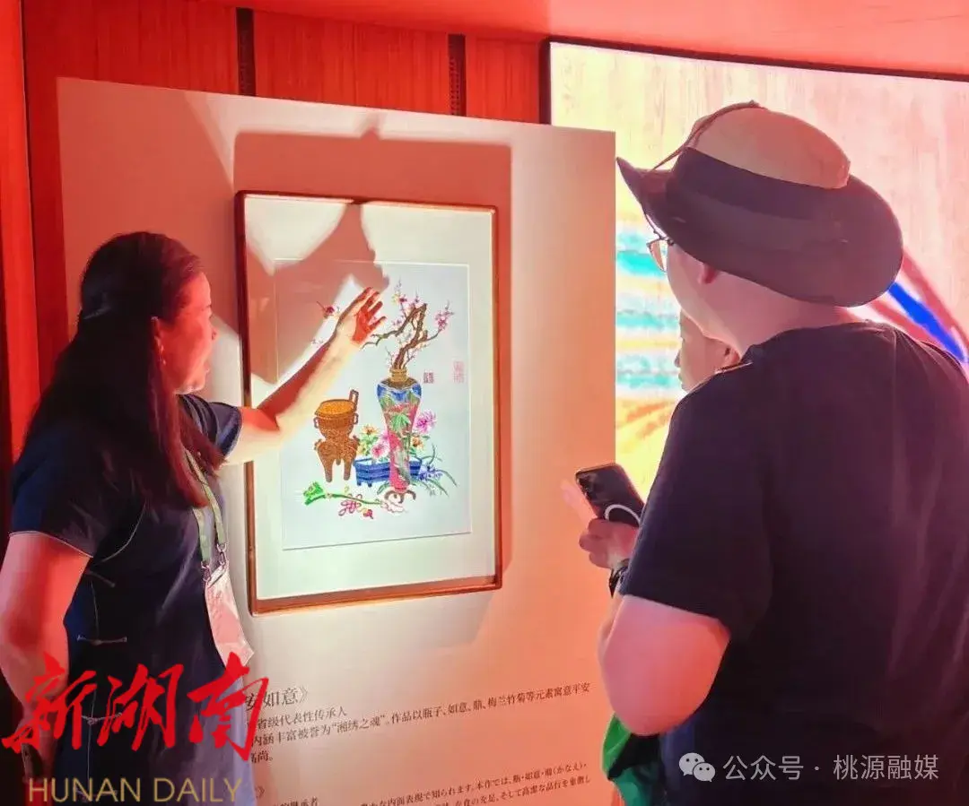 为了让更多人了解和喜爱桃源刺绣,活动现场还设置了互动环节。观众们可以亲自体验刺绣的乐趣,在罗明华的指导下,拿起绣针,感受丝线在指尖滑过的奇妙感觉。同时,现场还有多语言讲解,详细介绍桃源刺绣的历史、文化和艺术价值,让来自不同国家和地区的观众都能深入领略这一传统手工艺的魅力。