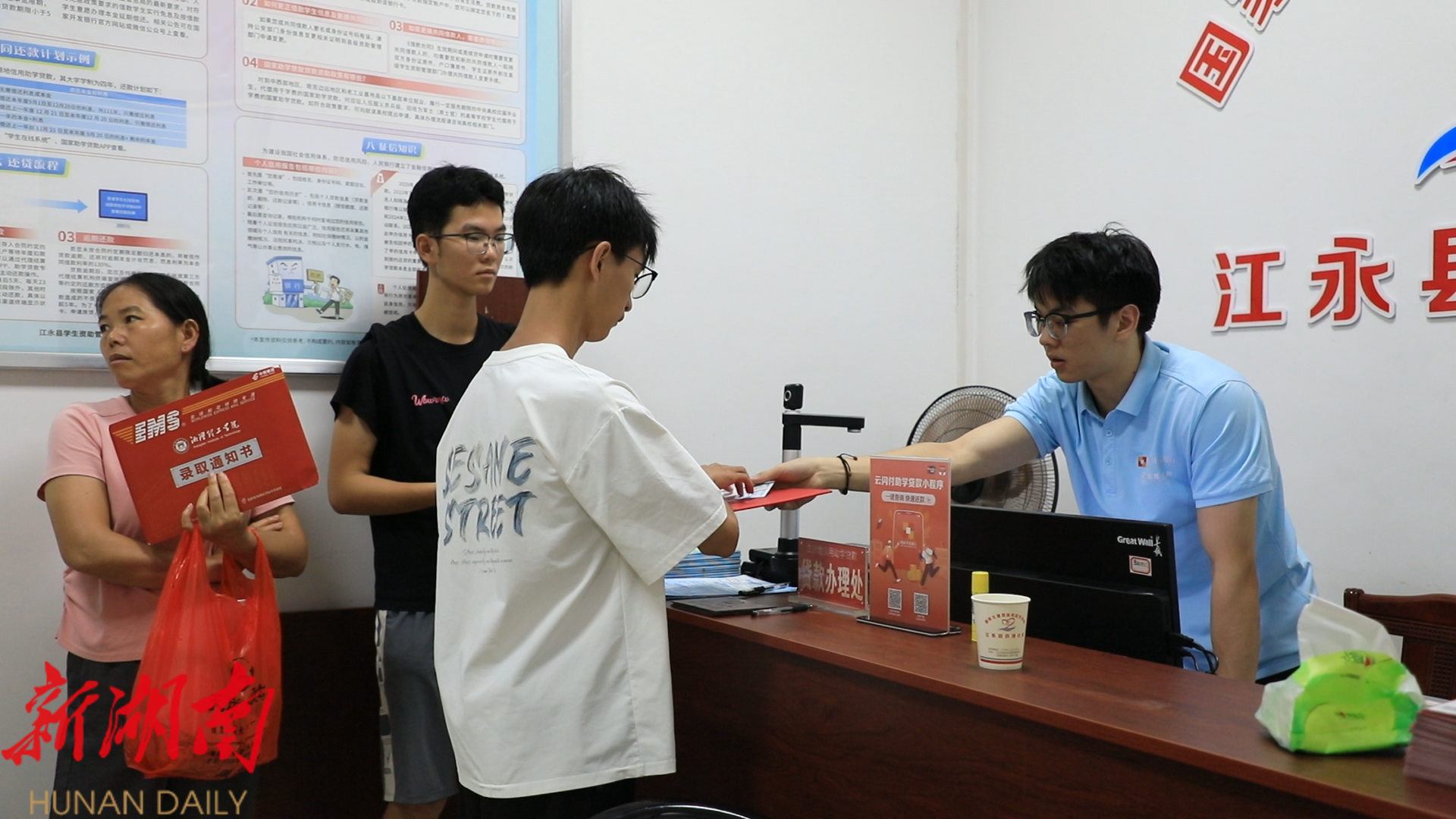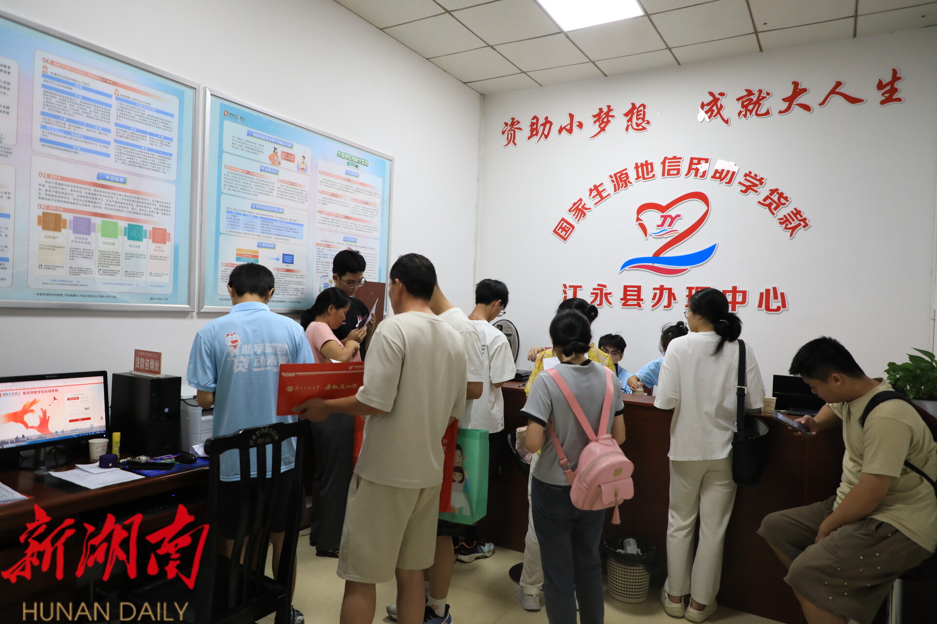 江永融媒8月12日讯(记者 周佳琳) 随着大学录取通知书陆续送达,江永县教育局学生资助管理中心也迎来了办理国家生源地信用助学贷款的高峰期。今年,中心将办理环节集中在同一办公区域,安排志愿者全程引导,实行“一站式”服务,确保“来一次就办好”。