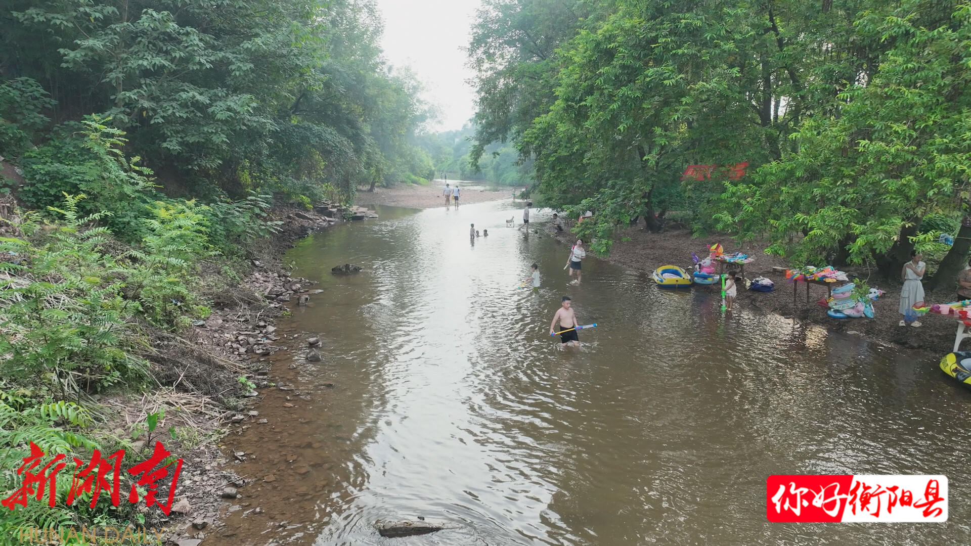 随着人气不断攀升, 当地村民趁势 在小溪畔设 起了流动 摊位,售卖 充气坐艇 、水枪 、捞鱼网 等戏水用品 ,不仅满足了游客的游玩需求,还能额外增加一份收入。
