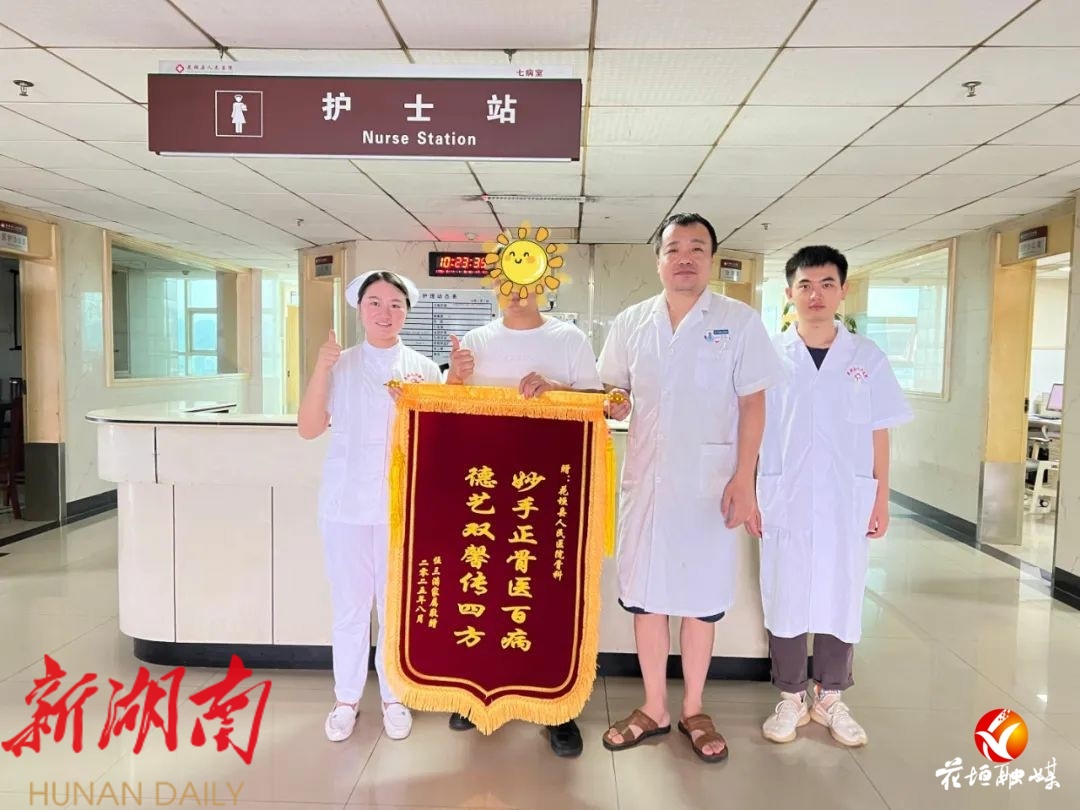 湖南日报·新湖南客户端8月12日讯(通讯员 陈慧群 吴春)8月11日上午,花垣县人民医院骨科医护人员正在紧张忙碌时,一名男子走进办公室,将一面红彤彤的锦旗交到护士长吴春手中。送锦旗的是出院患者伍大姐的儿子,他专程前来表达对骨科医护团队的感谢。