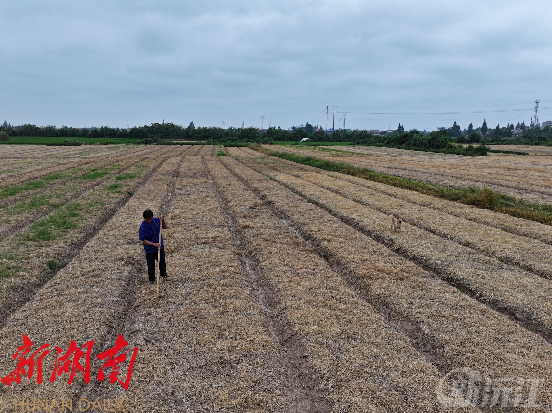 在民主村的蒜薹田,农户方夏成正专注地忙碌着。他俯身弯腰,手持木棍从身旁的秸秆堆里勾出一束束干燥的秸秆,小心翼翼地铺在刚种下蒜薹 种的土地上。方夏成今年种了7亩蒜薹以及10余亩稻田。早在早稻收割后,他就把产生的秸秆收集了起来,等到7月蒜薹播种完毕,便将这些秸秆覆盖在了蒜薹田里。经过方夏成的精心打理,秸秆整齐地覆盖在土地上,宛如给大地披上了一层金色的铠甲,默默守护着土里的蒜种。