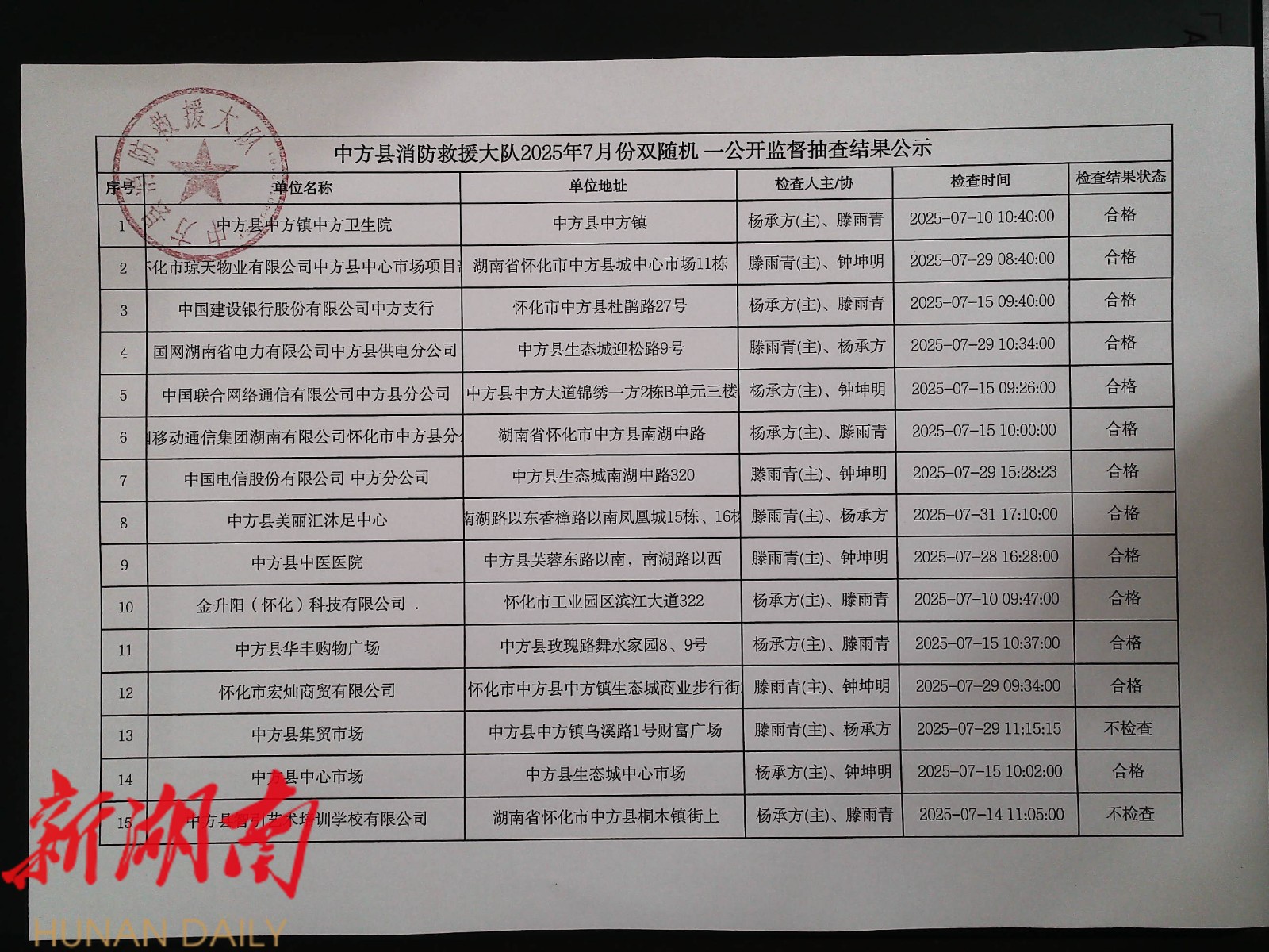 中方县消防救援大队“双随机、一公开”监督抽查任务公示
