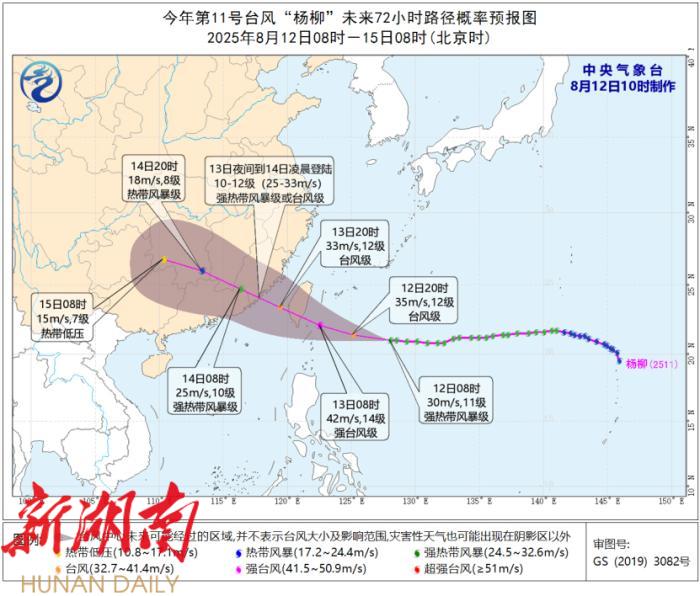 据中国天气网消息,预计今年第11号台风“杨柳”将以每小时25公里左右的速度向偏西方向移动,将于13日中午前后、13日夜间至14日凌晨先后在台湾东南部沿海以及福建南部到广东东部一带沿海登陆,中央气象台12日6时发布台风黄色预警。中国气象局启动重大气象灾害(台风)Ⅲ级应急响应,福建、广东、广西、湖南、江西、贵州等可能受台风影响的省级气象局根据实际研判启动相应级别应急响应。各单位要严格按照气象灾害应急响应工作流程做好防台风各项气象服务。