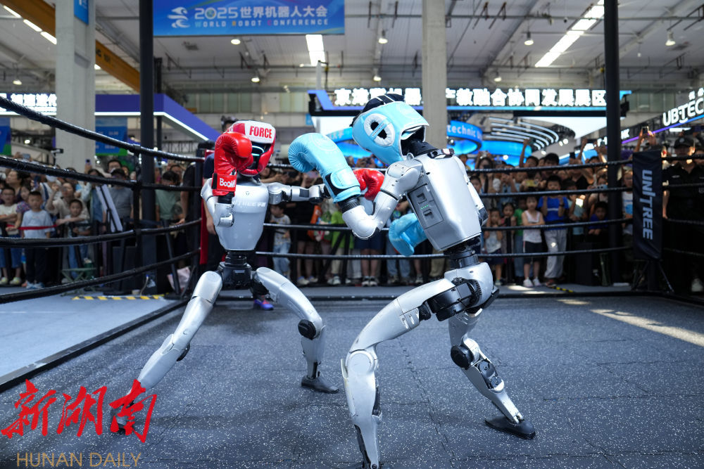 在2025世界机器人大会展馆内,观众在宇树机器人展台观看机器人拳击展示(8月11日摄)。新华社记者 鞠焕宗 摄