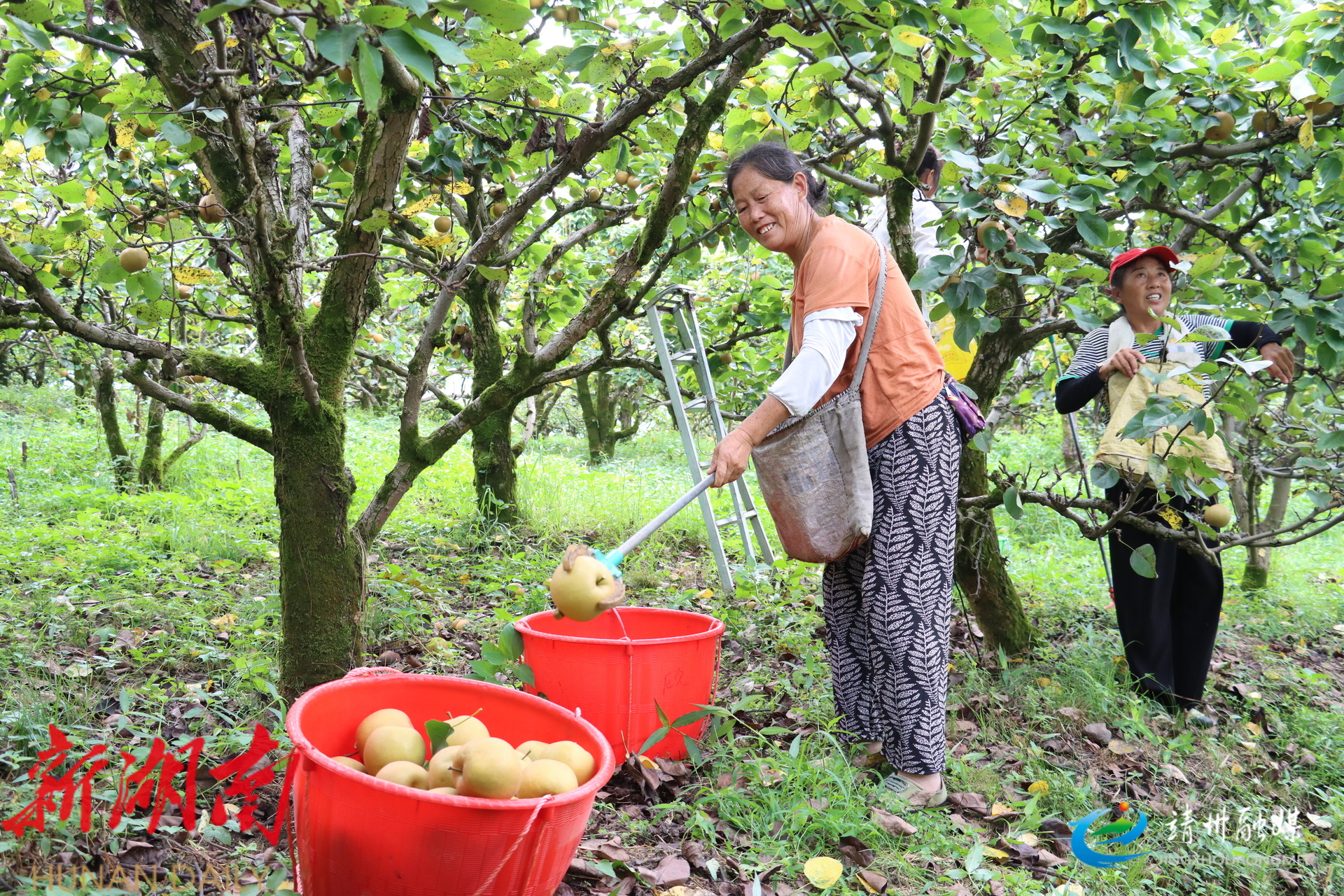 工人们正在采摘金秋梨(钦苏芬 摄)