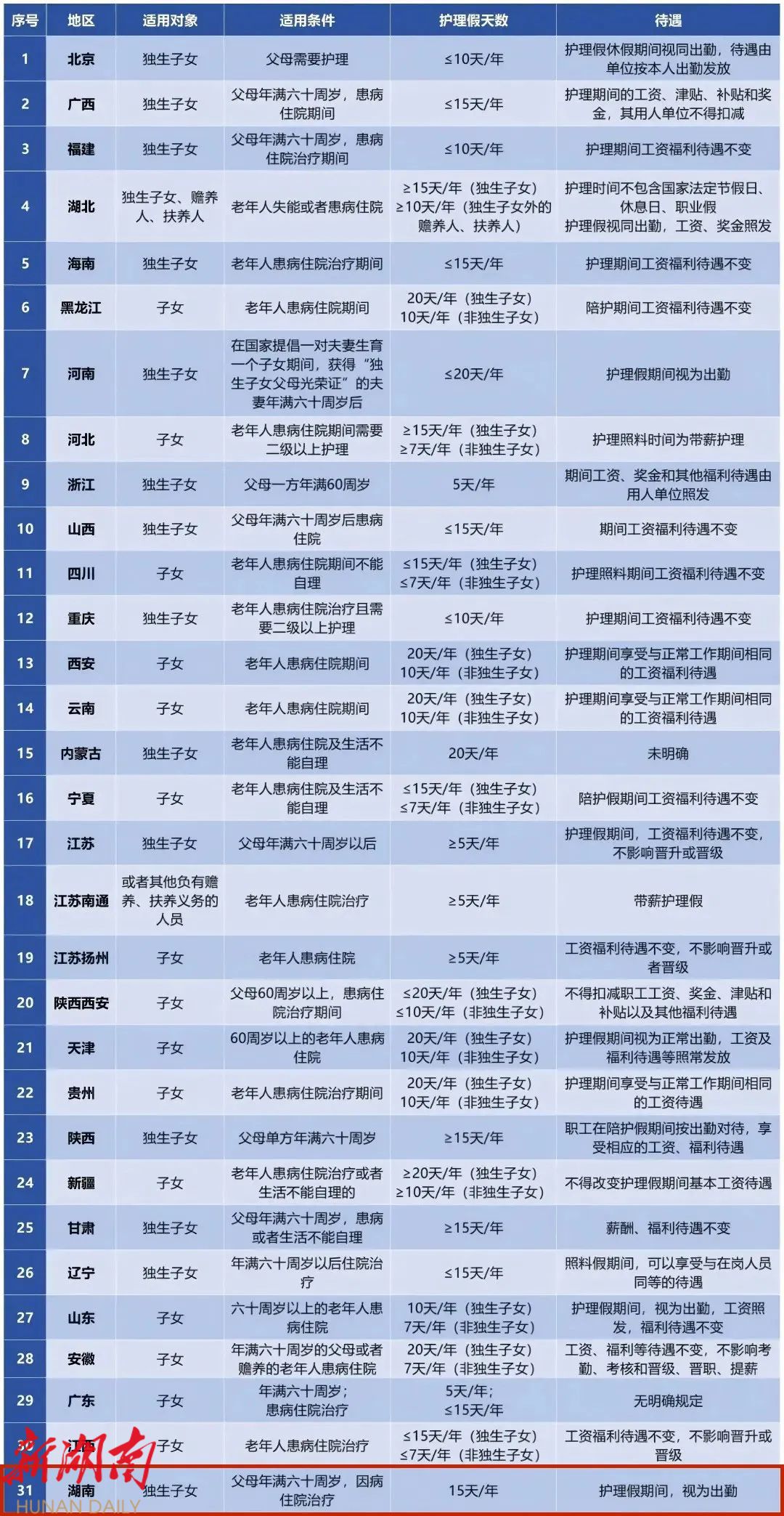 其中,值得注意的是,还有十余省份,非独生子女同样可享受护理假,不过假期天数少于独生子女。