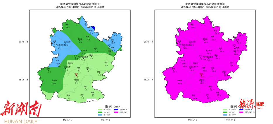 图3 13日08时至14日08时临武县降雨量预报图(左)、14日08时至15日08时临武县降雨量预报图(右)