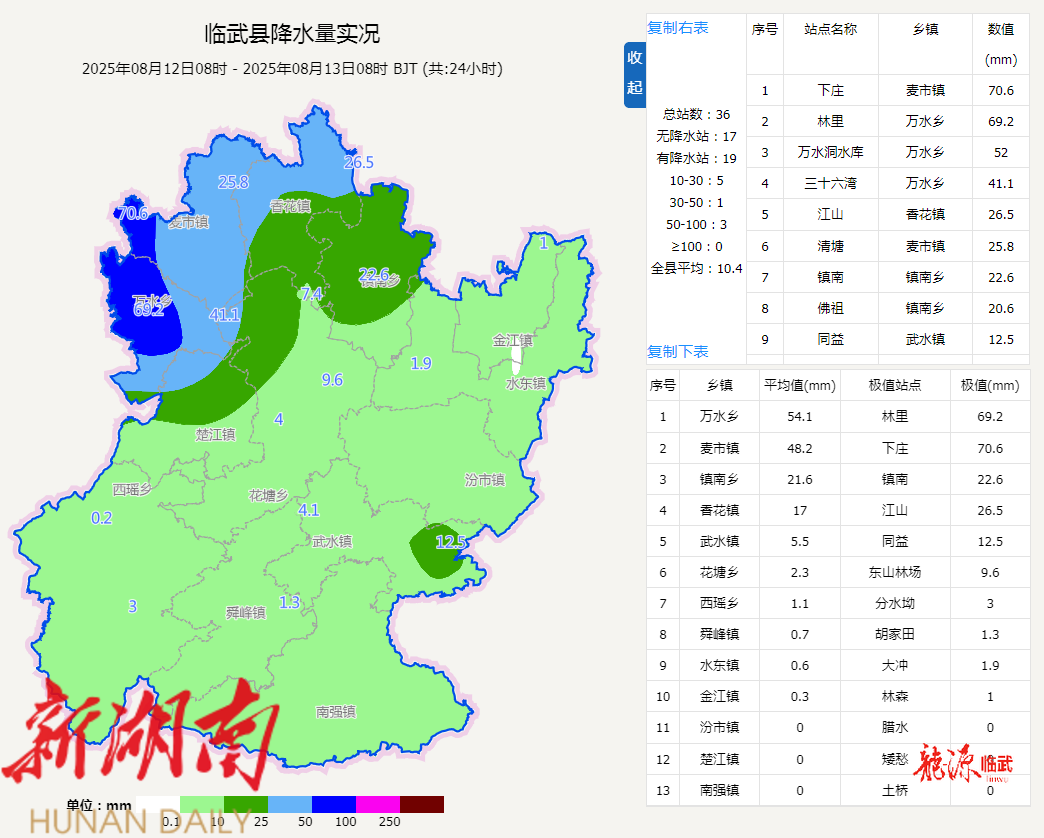 2025年08月12日08时至13日08时,临武县共有19站降雨,平均降水10.4毫米,其中0~9.9毫米10站,10~24.9毫米3站,25~49.9毫米3站,50~99.9毫米3站,最大降水70.6毫米(麦市镇下庄站),最大小时雨强70.5毫米(麦市镇下庄站,12日18时至19时)。
