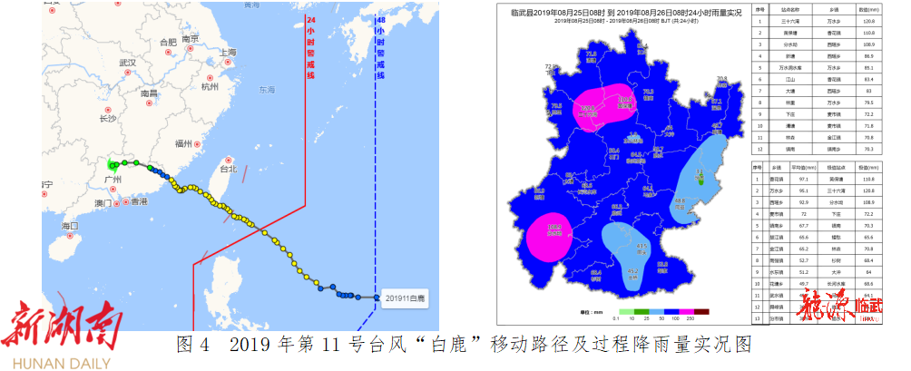 1911号台风“白鹿”:2019年8月21日生成,24日13时前后在台湾省屏东县沿海登陆(强热带风暴级),25日7时在福建东山沿海再次登陆(强热带风暴级),并在广东韶关减弱为热带低压,26日5时停止编号。停编后的台风残涡继续向西北方向移动,穿过永州中南部,在广西东北部填塞。受“白鹿”影响,2019年8月25日08时至26日08时,我县共有36站降雨,平均降雨量62.4毫米,其中50到99.9毫米24站,100到249.9毫米3站,最大降雨量120.8毫米(万水乡三十六湾站),最大小时雨强32.4毫米(西瑶乡分水坳站)。