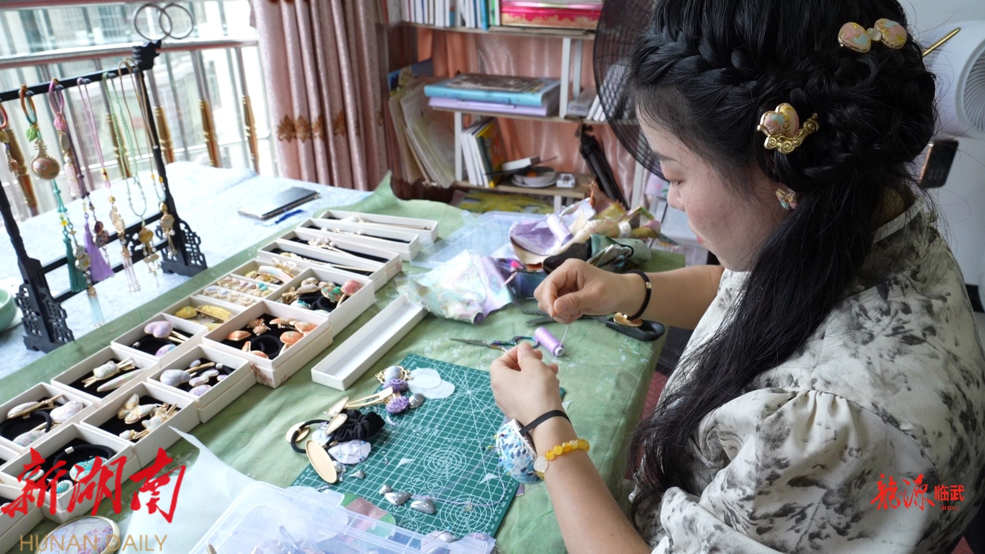“去年暑假,我们去南京参观了江南织造局,看到了许多精美的服饰和古老的织布机。参观结束后,我们在路边看到一些人佩戴着这种精致的发饰,我非常喜欢,就想着自己也可以尝试做一下。”临武县六完小美术老师石秀林说。