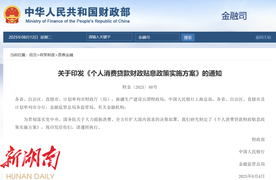 8 月 12 日,财政部、中国人民银行、金融监管总局印发《个人消费贷款财政贴息政策实施方案》(以下简称《实施方案》)。