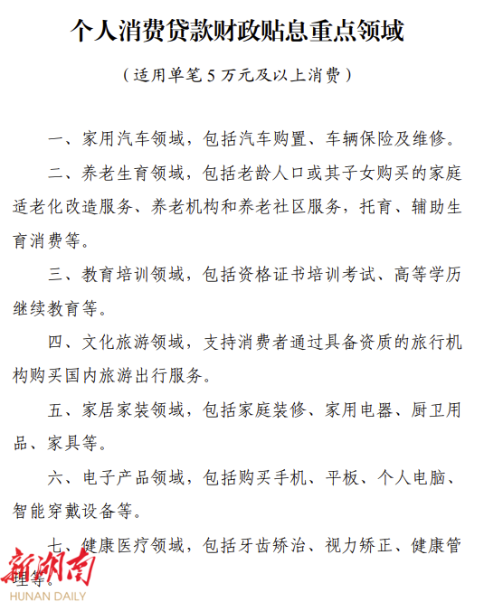 • 贴息范围:单笔 5 万元以下消费,以及单笔 5 万元及以上的家用汽车、养老生育、教育培训、文化旅游、家居家装、电子产品、健康医疗等重点领域消费(详见下图)。 单笔 5 万元以上的消费,以 5 万元消费额度为上限进行贴息。