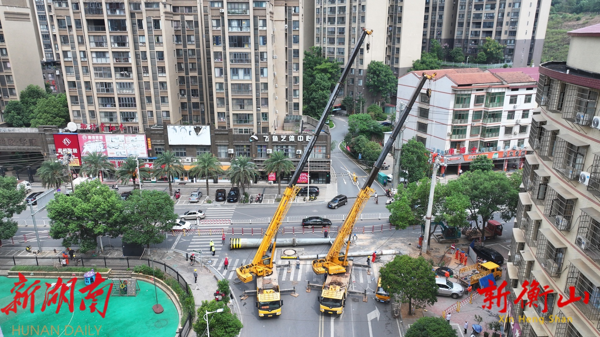 记者在现场看到,国网衡山县供电公司组织30名施工人员、两台吊车对电杆进行拆除作业。整个过程,施工人员配合默契、高效协作,周边居民、车辆有序绕行,施工现场秩序井然。据了解,这两根电杆原本并非处于道路中间,后来因城市发展“迁移”到现在的位置。