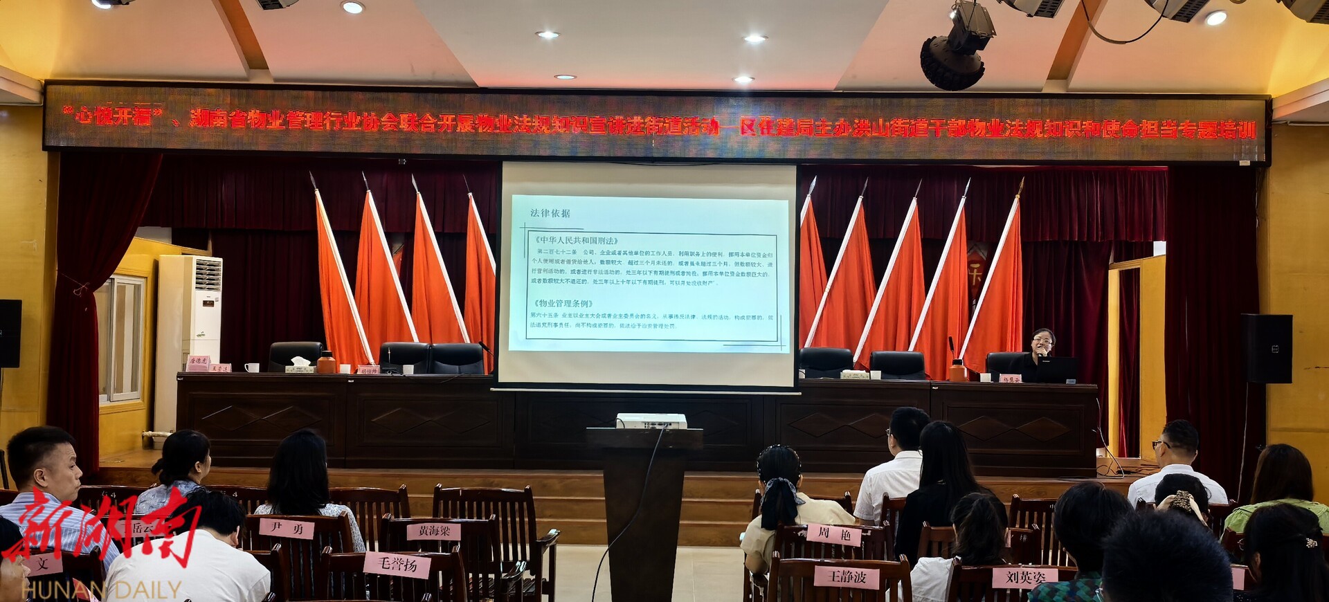 湖南日报·新湖南客户端8月14日讯(通讯员 唐德虎)为全面提升全区物业管理服务质量,规范工作流程,强化基层人员专业能力,8月14日下午,开福区住建局在洪山街道办事处启动“物业管理专题培训下基层”活动。活动特邀“心悦开福”公益服务团队和湖南省物业管理行业协会专家授课,洪山街道及社区约百名工作人员参加培训,系统学习物业法规运用与使命担当,为破解基层治理难题、服务辖区群众夯实基础。