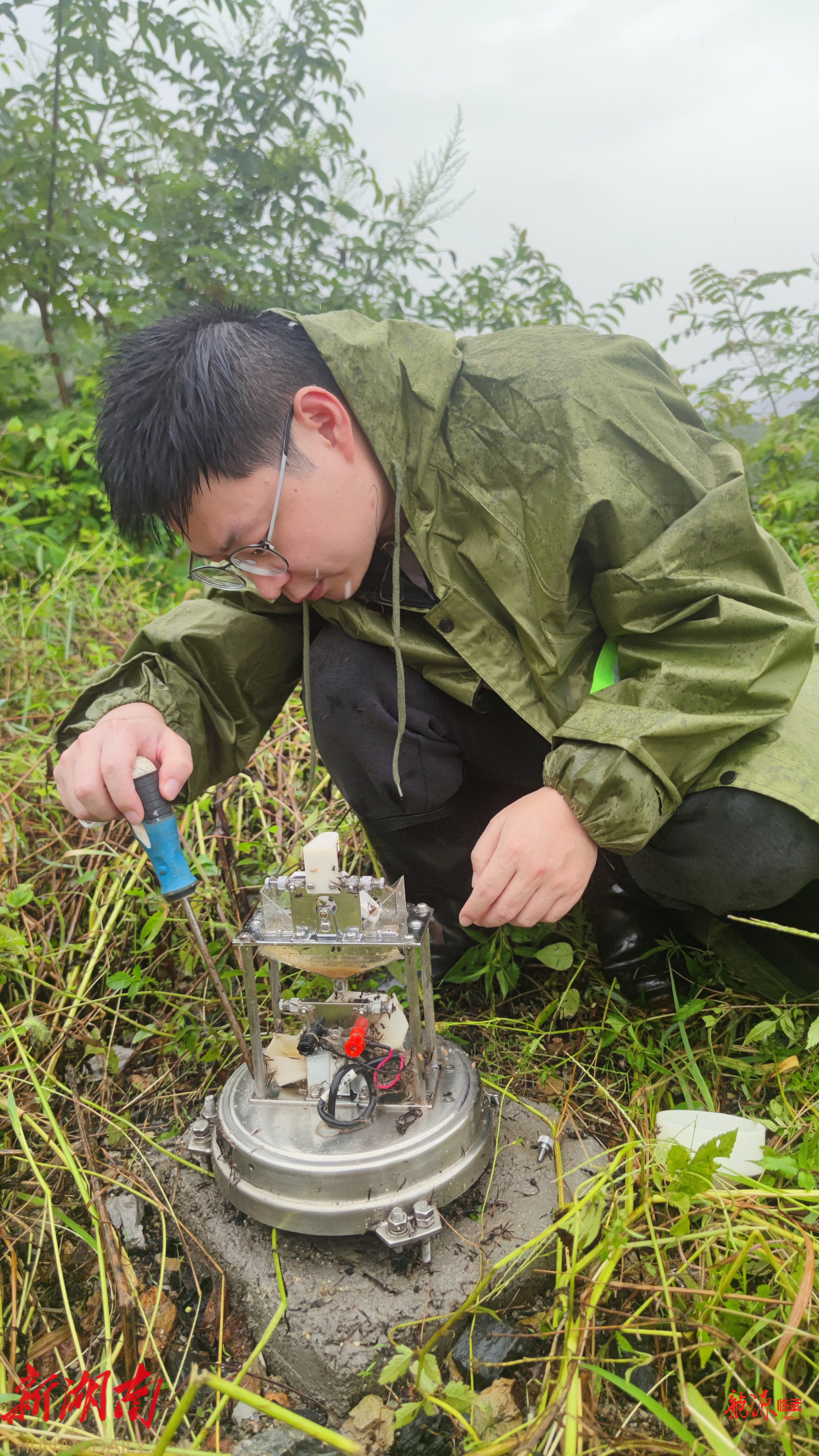 冒雨抵达站点后,工作人员细致检查,发现雨量传感器故障因降雨夹杂泥沙、落叶等杂物堵塞雨量筒所致,在疏通雨量筒后,工作人员马上又对站点运行情况再度进行了详细检查。